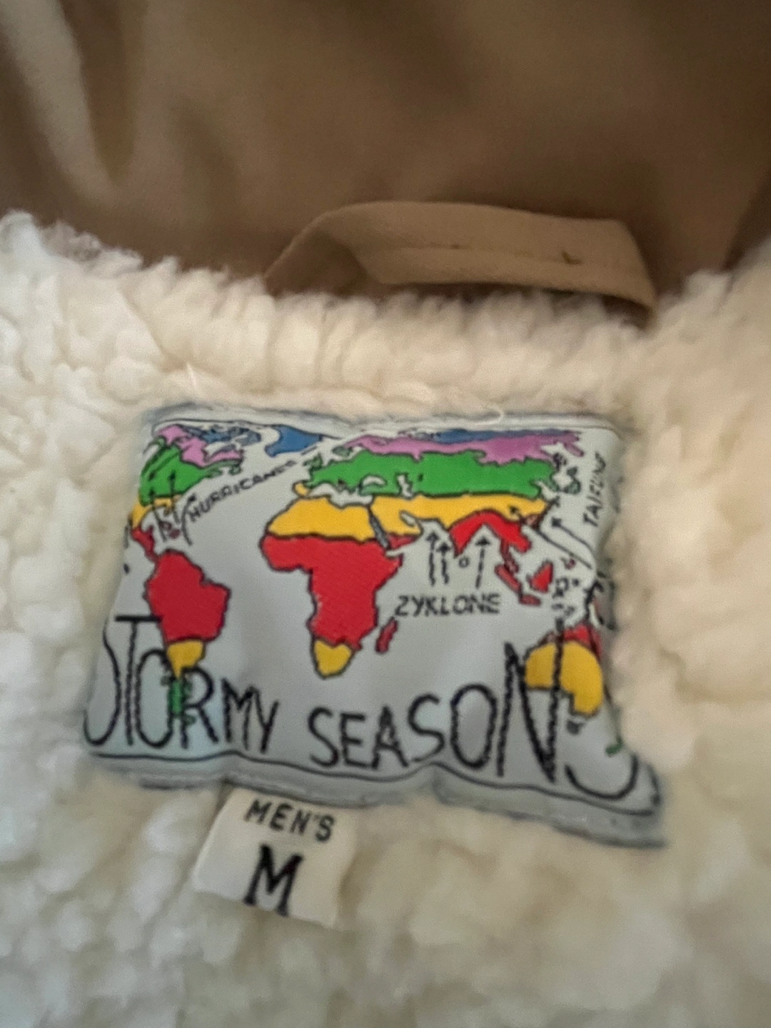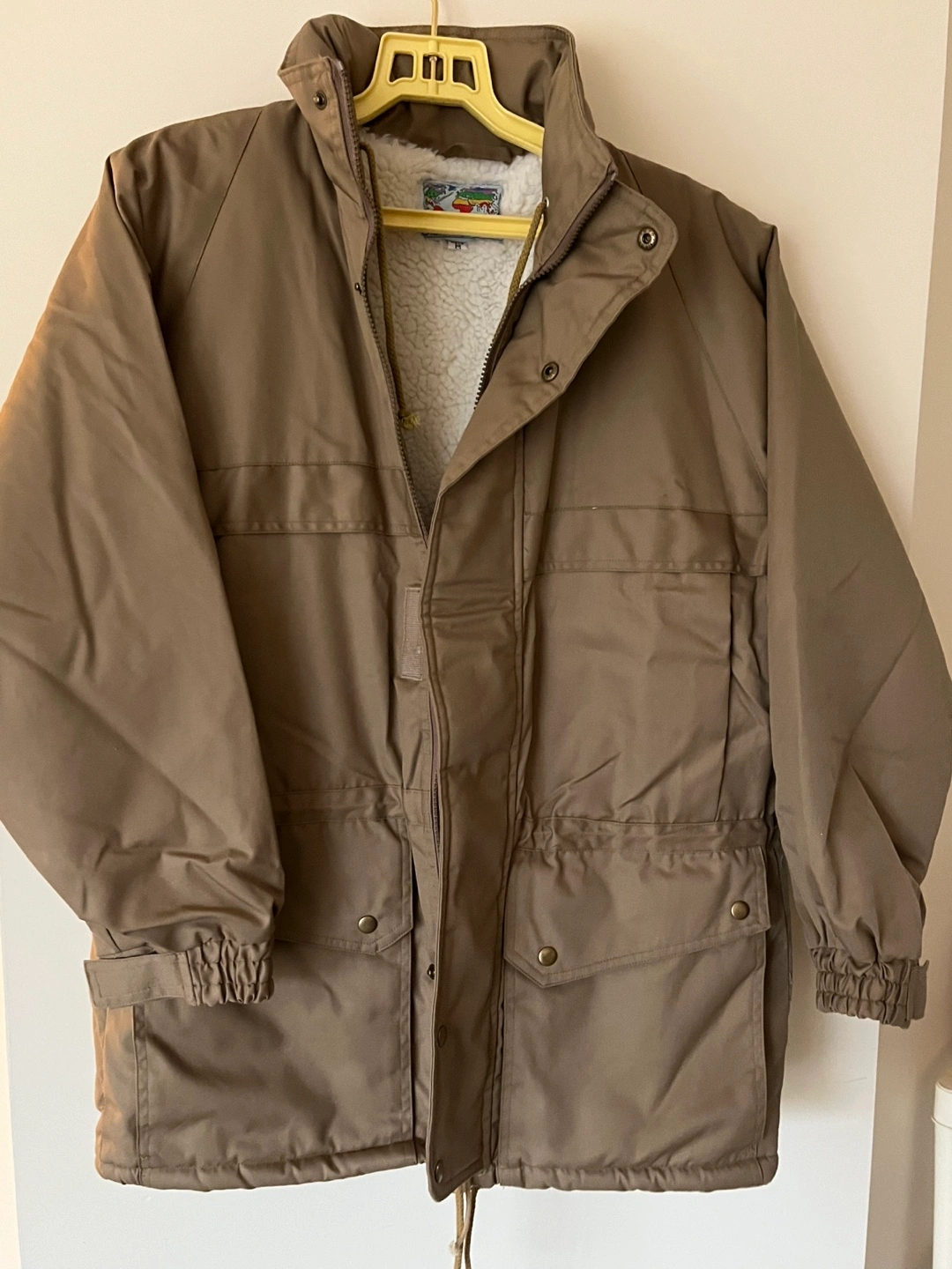 New men's Size M brown winter jacket with fleece lining. Has zipper and button closure, multiple pockets, and drawstring waist and hood. If the ad is up, the jacket is available.