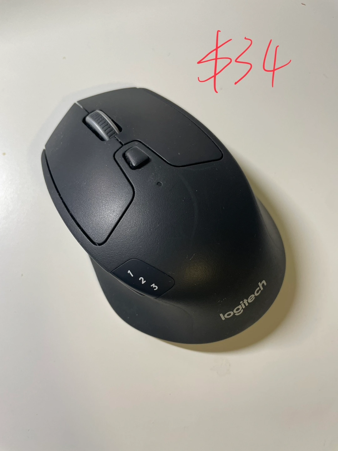 Wireless mouse with scroll wheel and buttons. Includes a receiver. A battery (used several times) also included.