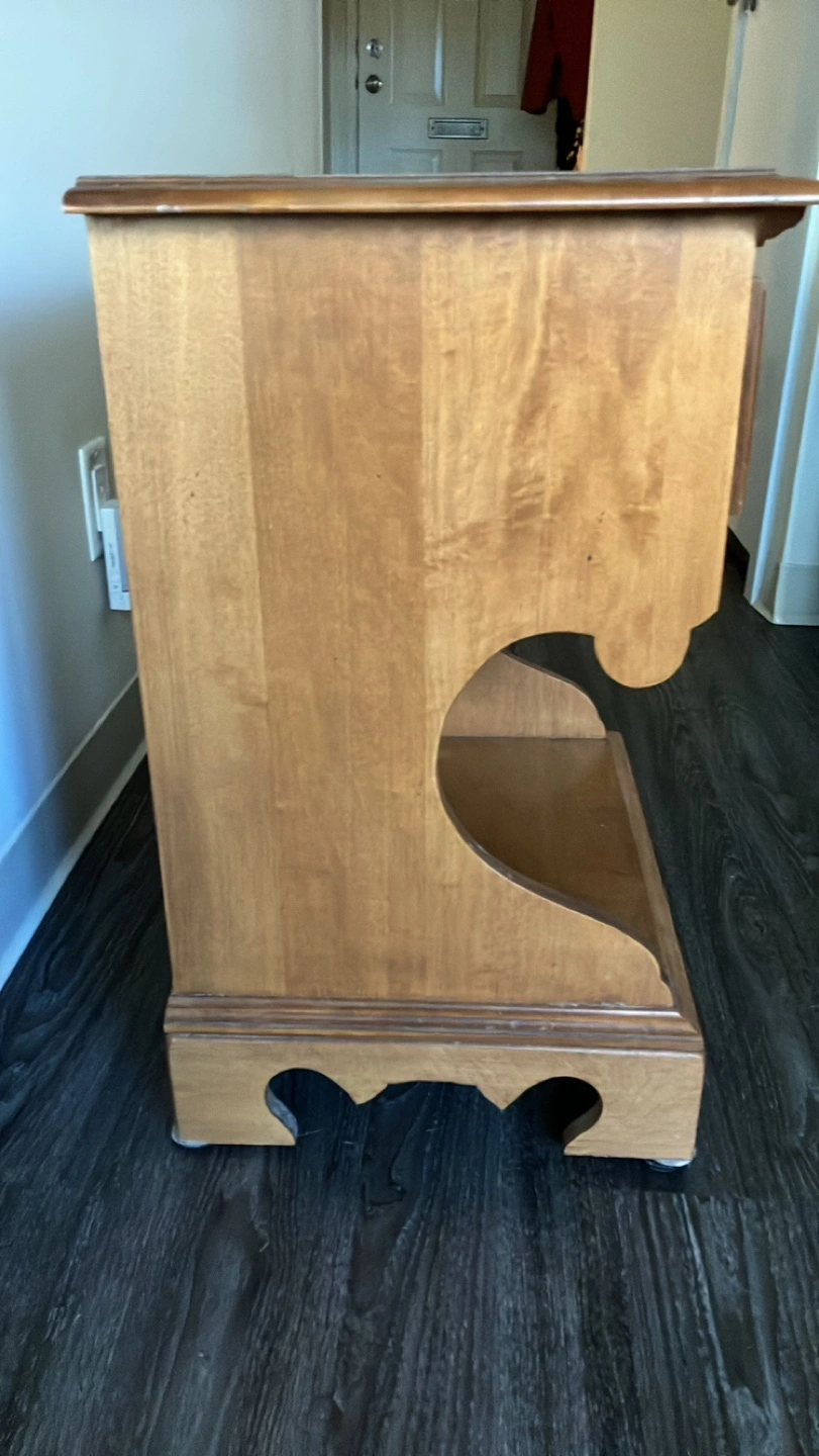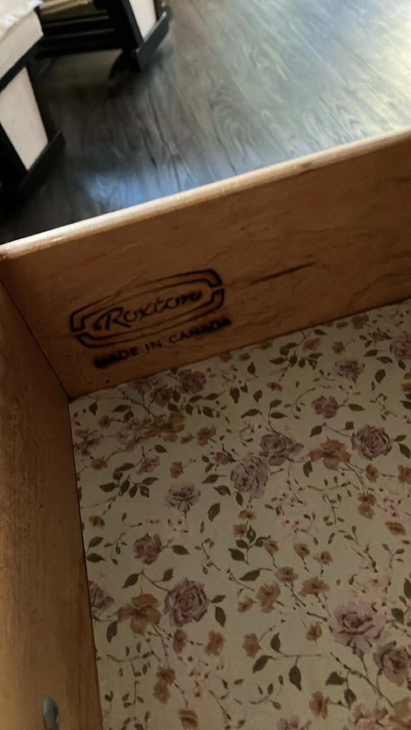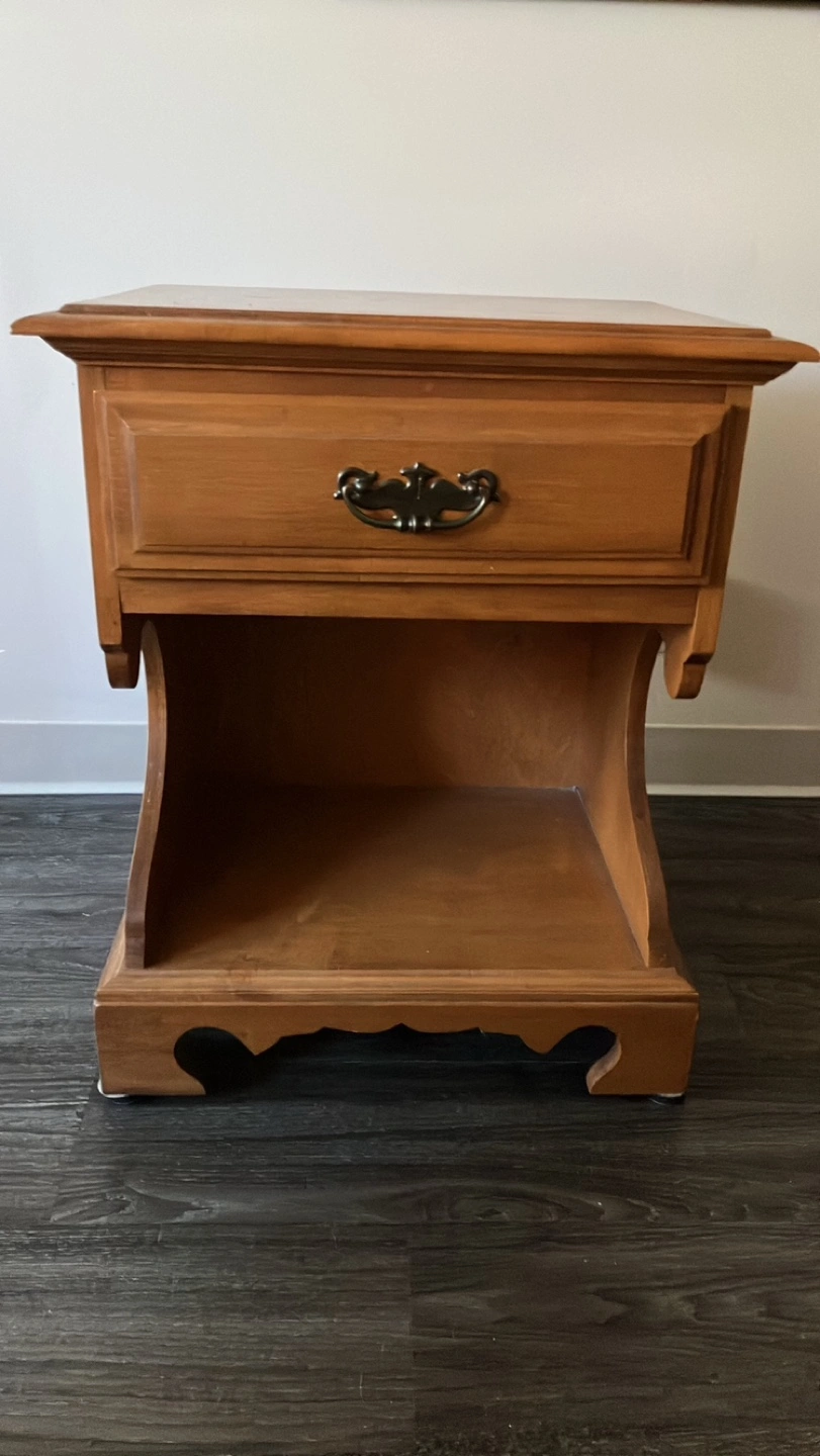 Solid wood Roxton nightstand with a drawer and a shelf. It has a unique design with a curved bottom shelf. The drawer has a floral pattern on the inside.