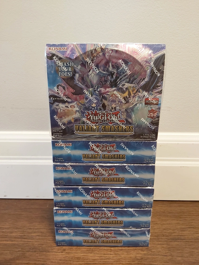 Yu-Gi-Oh! Trading Card Game Valiant Smashers Booster Box. Sealed and factory fresh. Contains 24 packs. Each pack contains 7 cards.