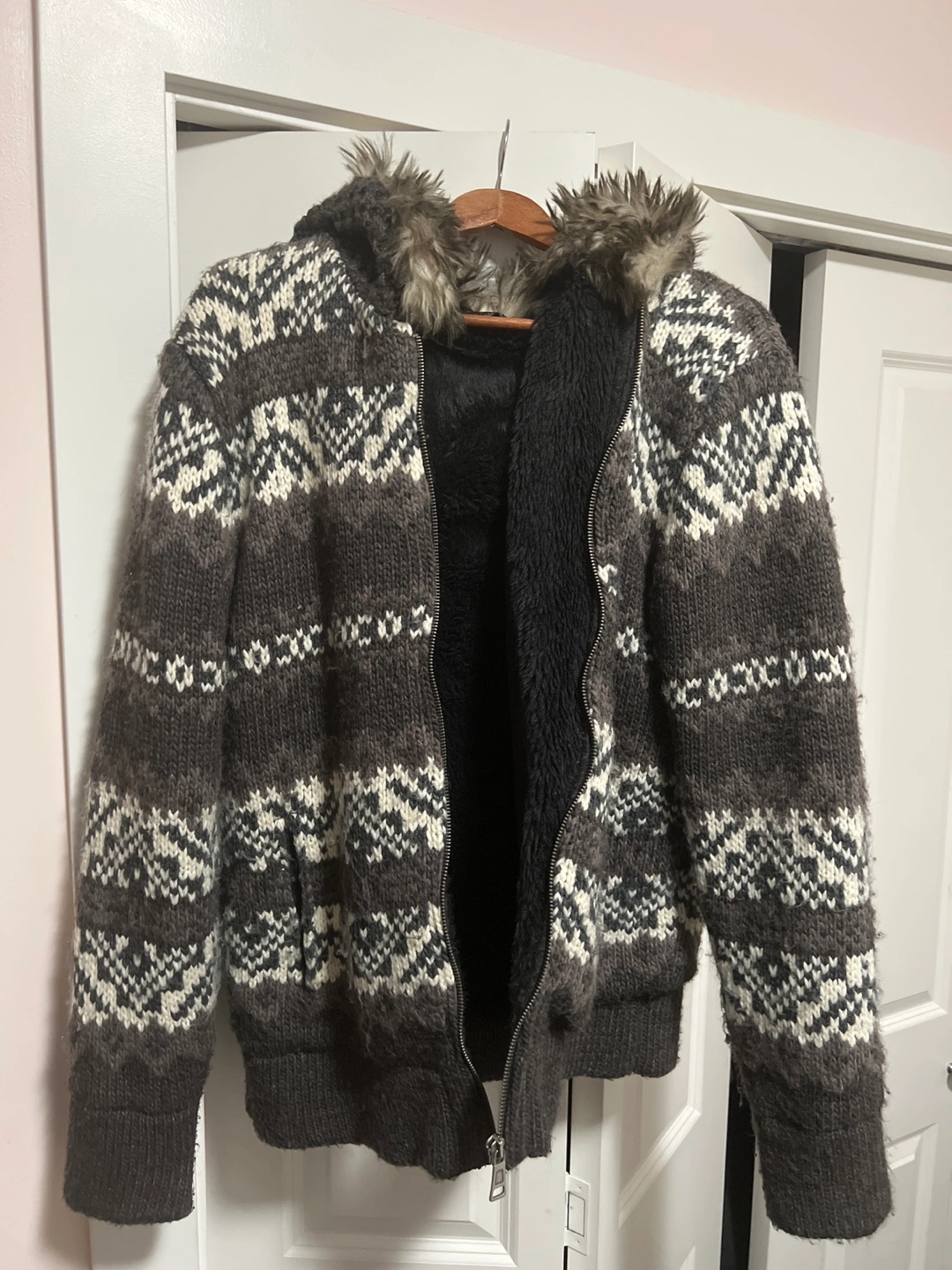 Knitted jacket with a faux fur hood. Features a zipper closure and a black fleece lining.