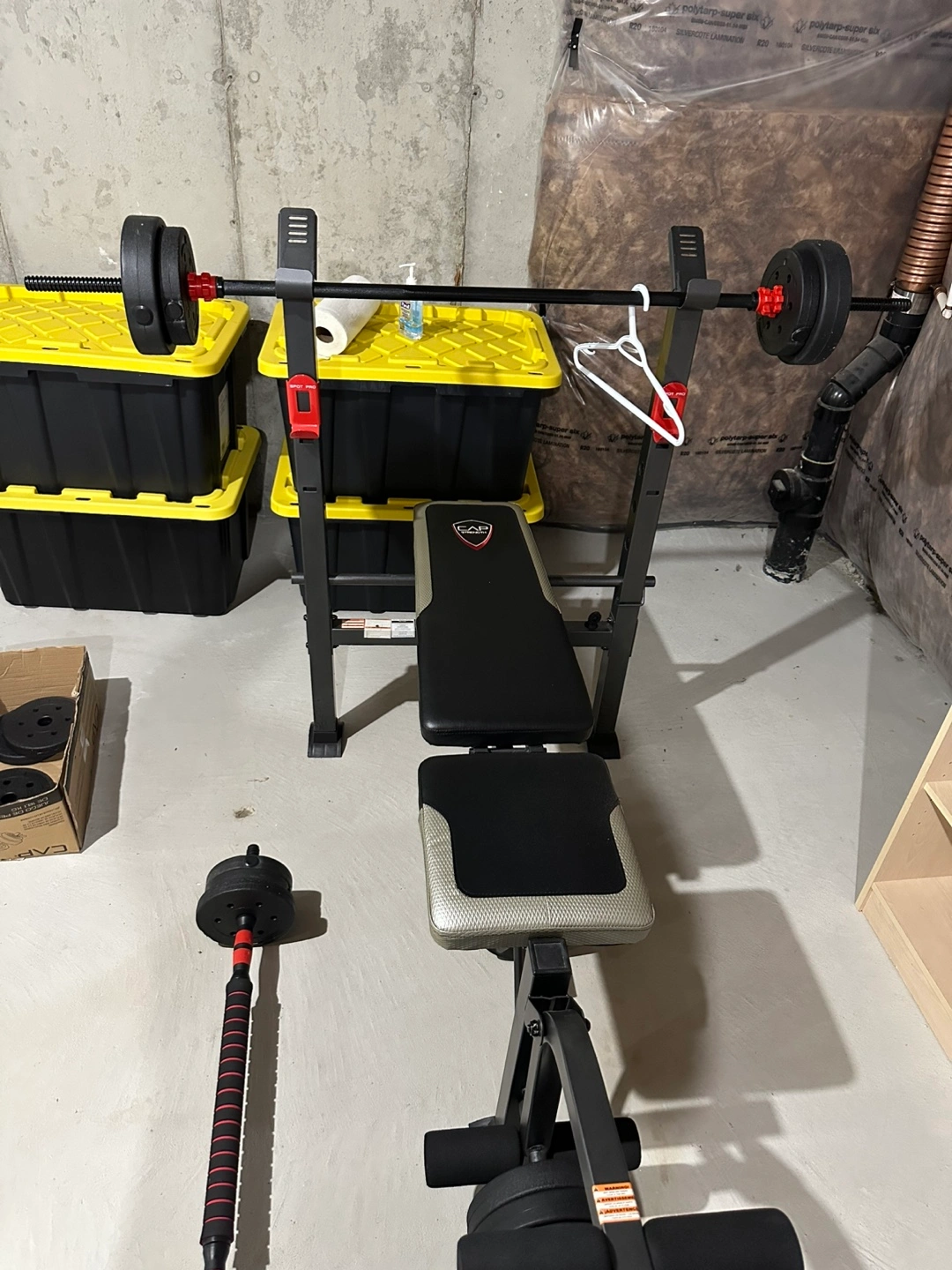 Weight bench with barbell and weights. Includes a weight bar, weight plates, and a bench. The bench can be adjusted to multiple positions.