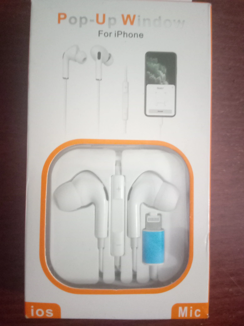 White wired earbuds with a lightning connector. Includes a microphone. Comes in original packaging.