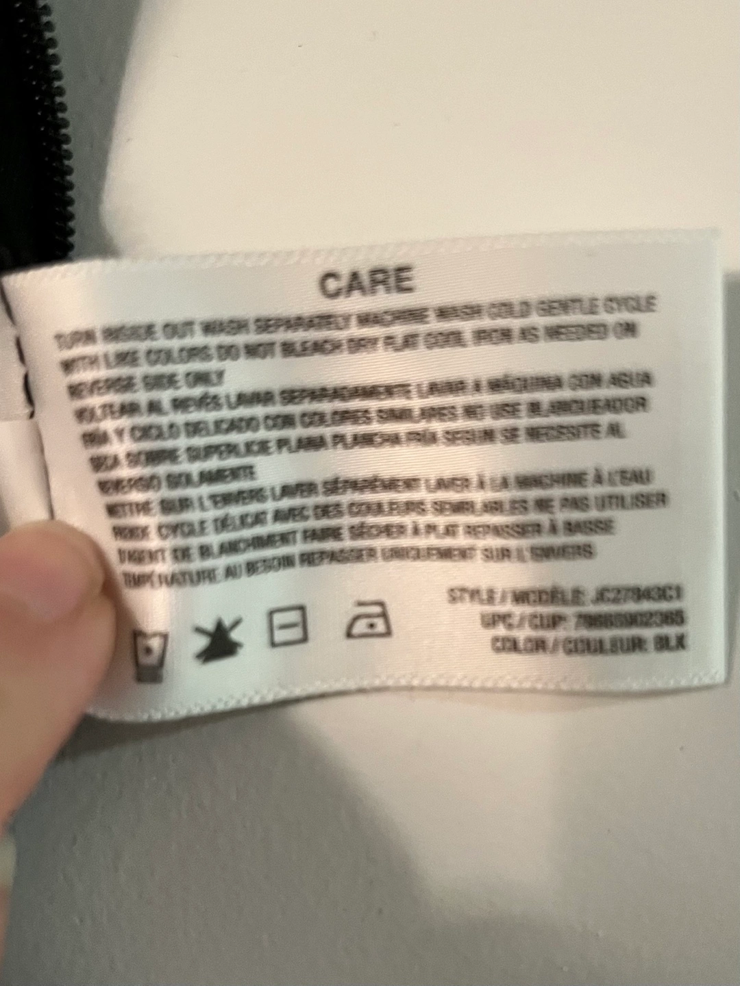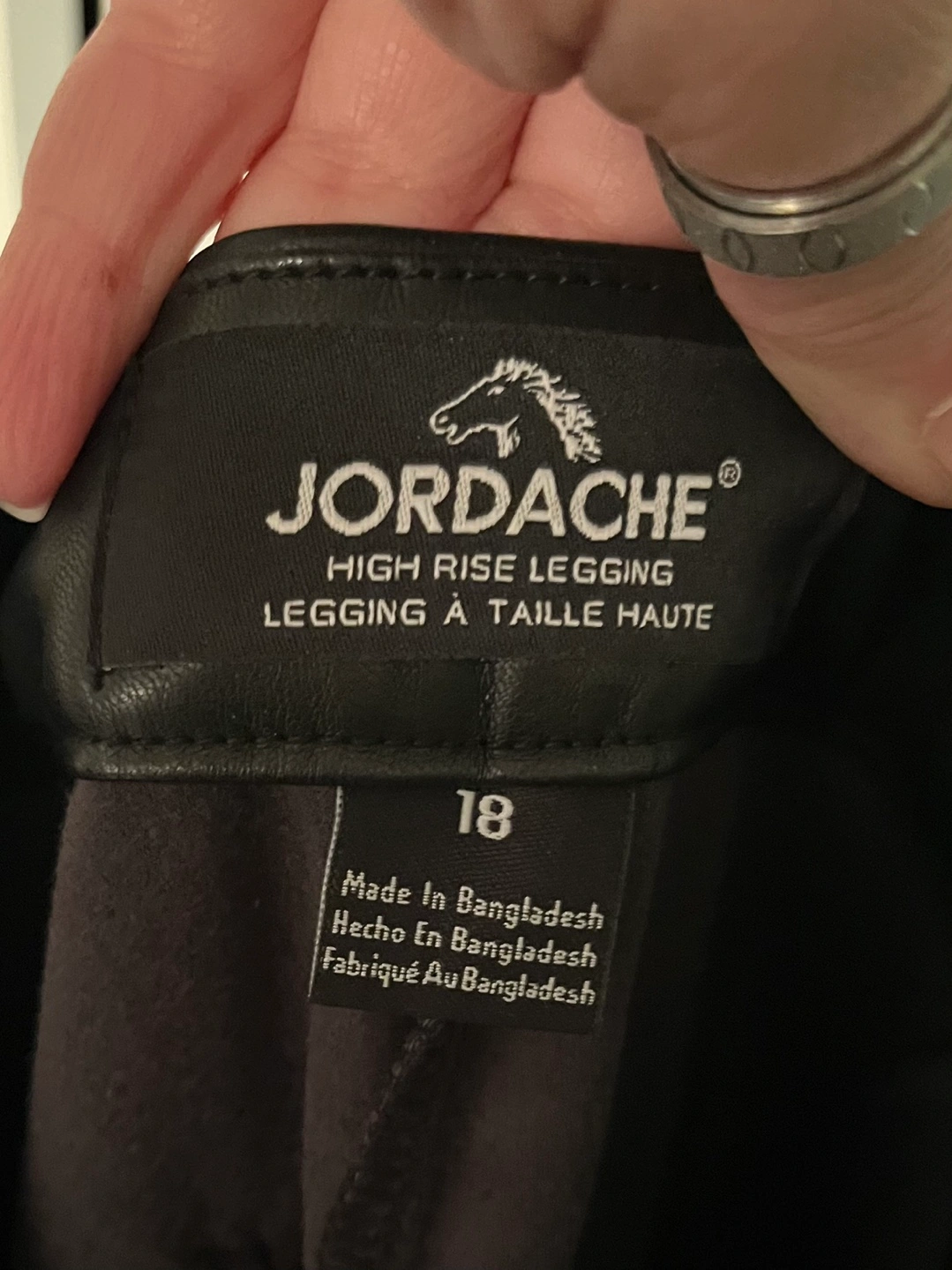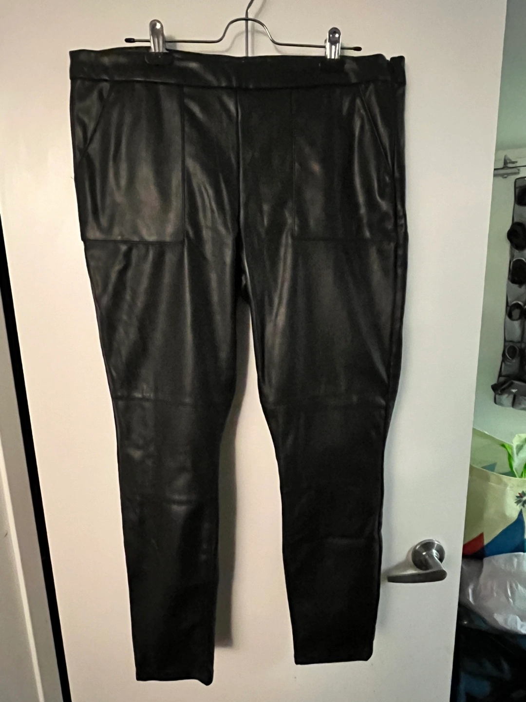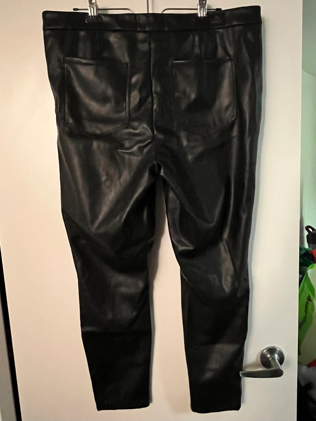 Black faux leather pants with a side zipper, two front pockets, and two back pockets. Very comfortable and durable material. Only worn a couple times. Excellent condition.