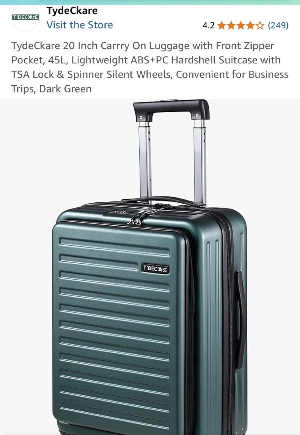 20 inch carryon luggage. Purchased from Amazon. Barely used, like new. Front zip pocket. 45L. Lightweight ABS+PC hard shell suitcase with TSA lock and spinner silent wheels.