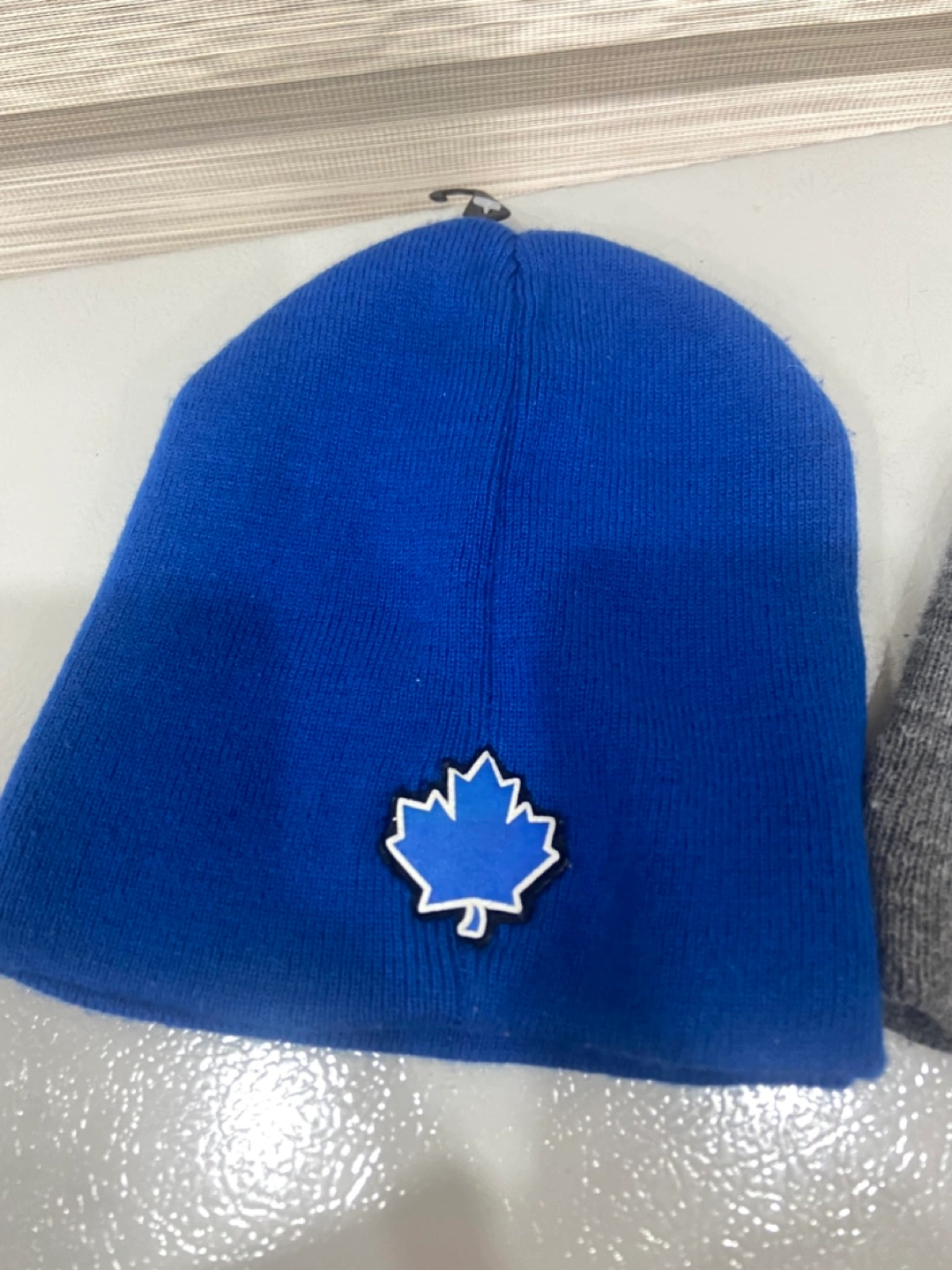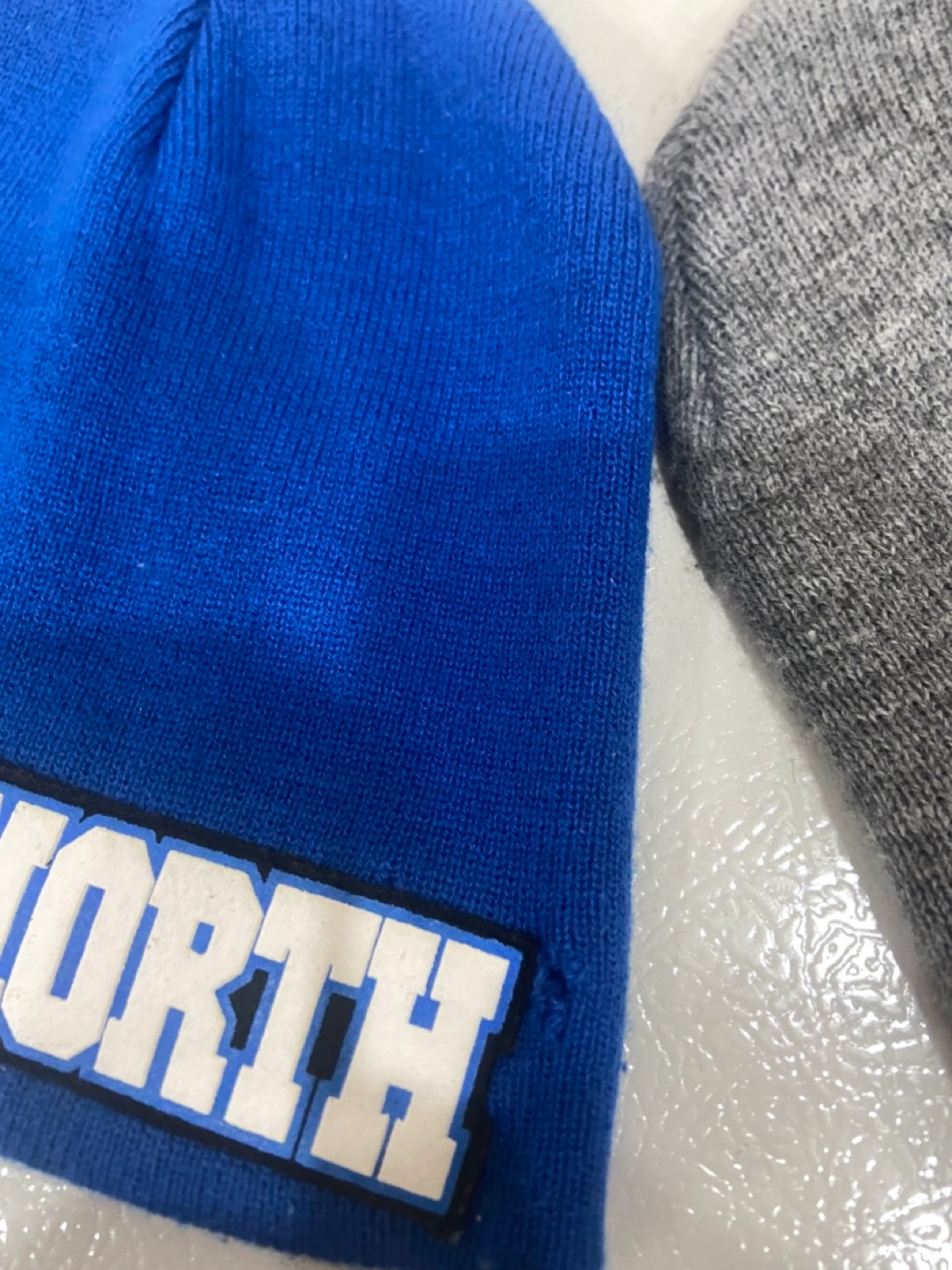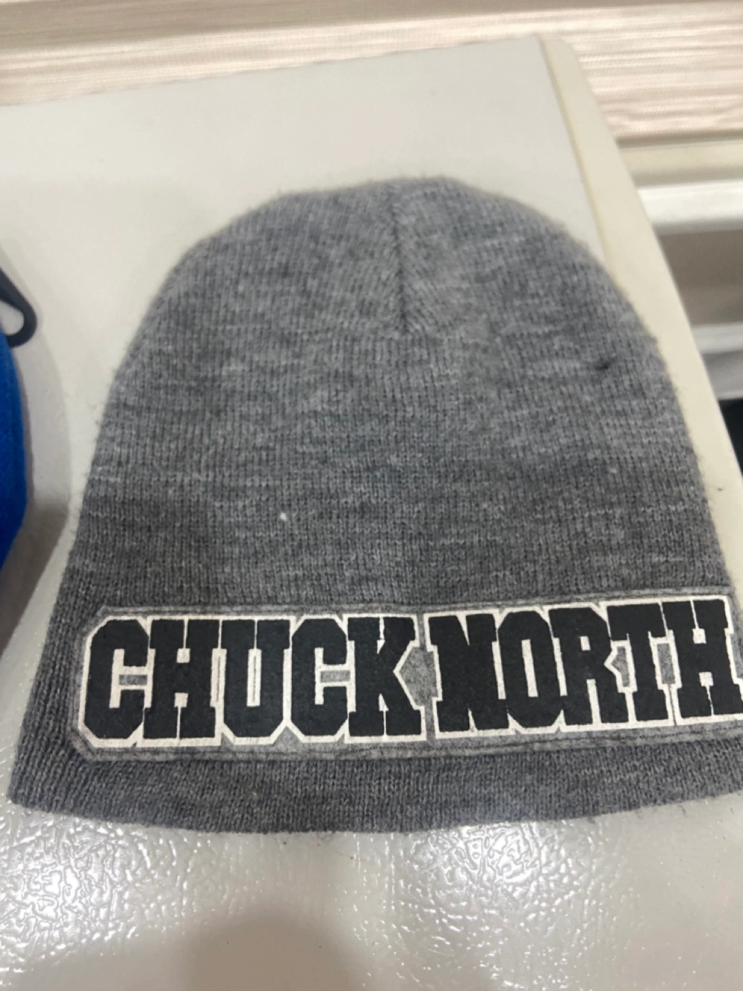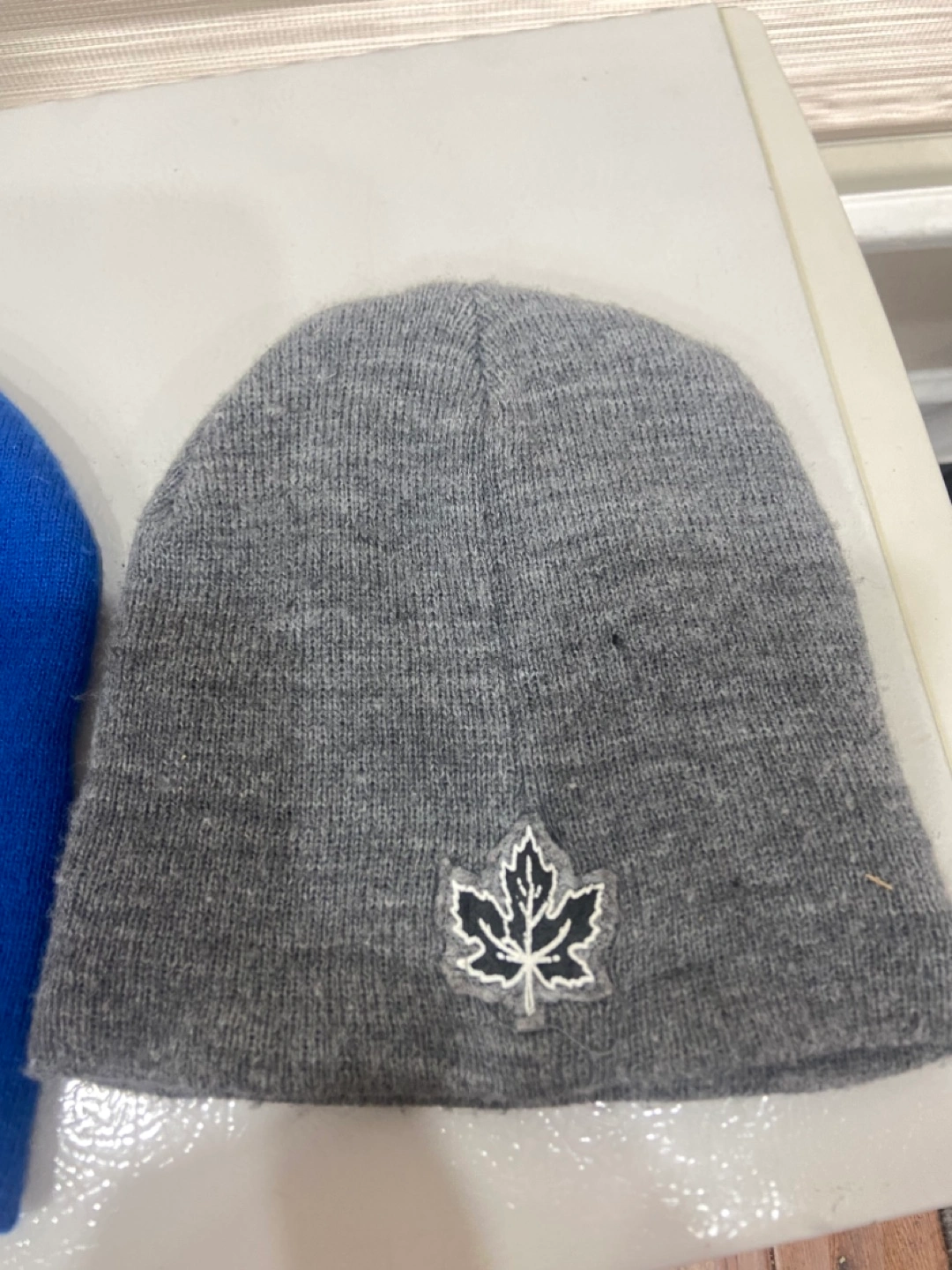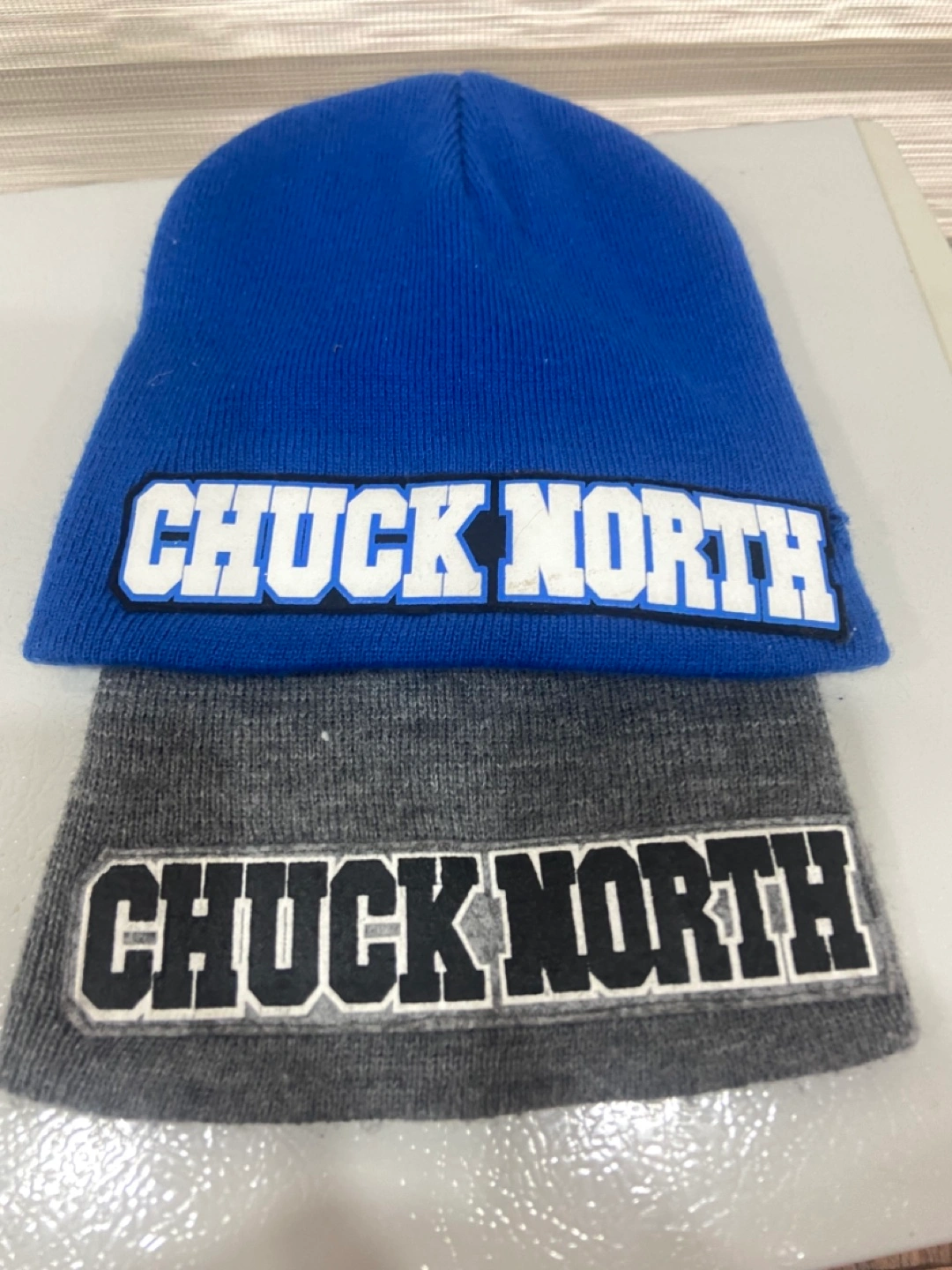 Two beanies, one blue, one grey. Both feature a black and white Chuck North logo and a black and white maple leaf. Both are in good condition.