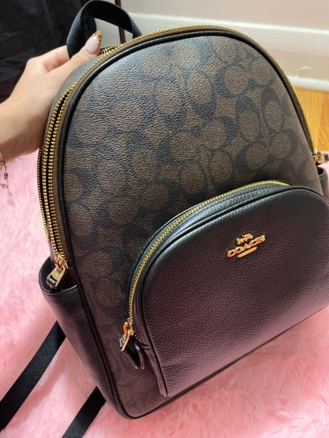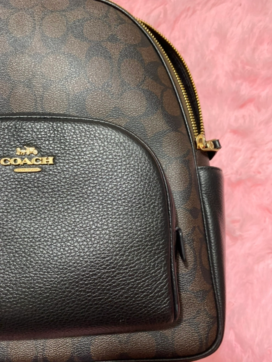 Brown and black signature Coach backpack with gold hardware. Has one large compartment and a small front pocket with a zipper. Includes an adjustable strap for shoulder carrying.