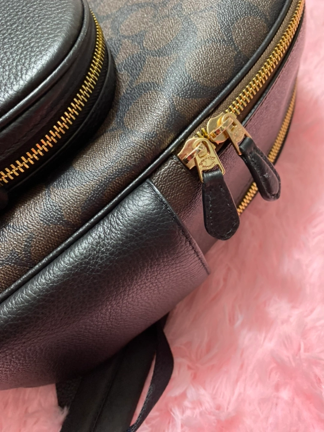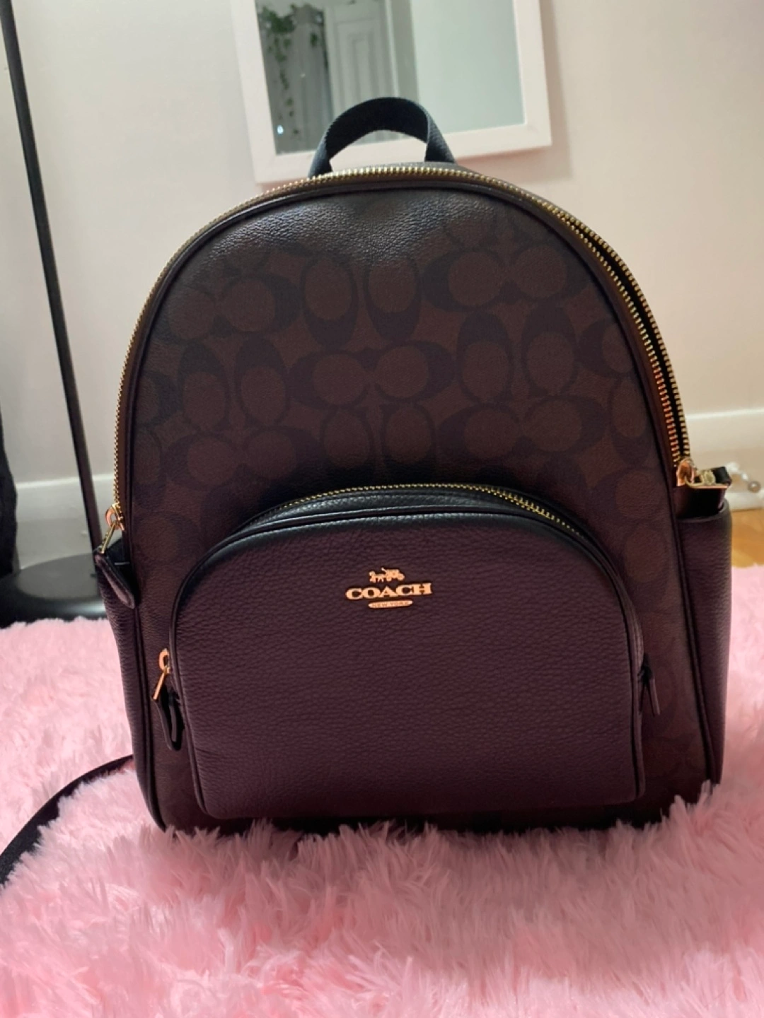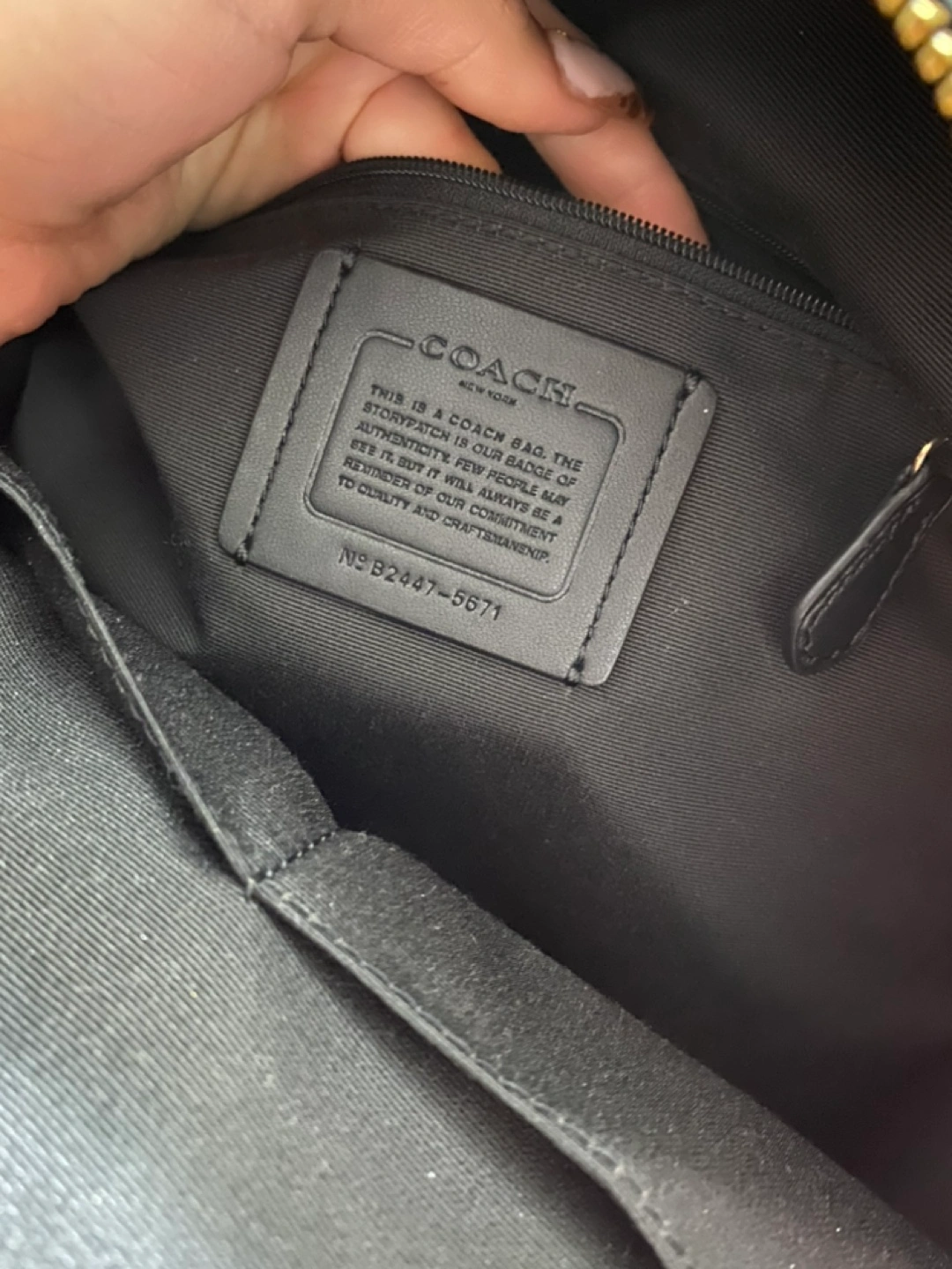 Brown and black signature Coach backpack with gold hardware. Has one large compartment and a small front pocket with a zipper. Includes an adjustable strap for shoulder carrying.
