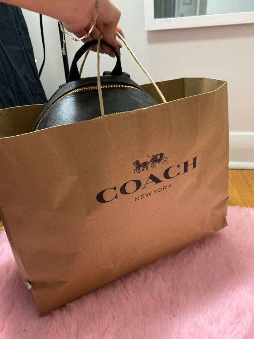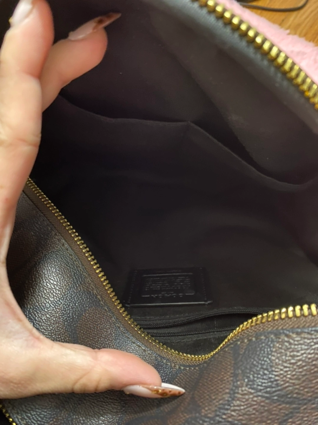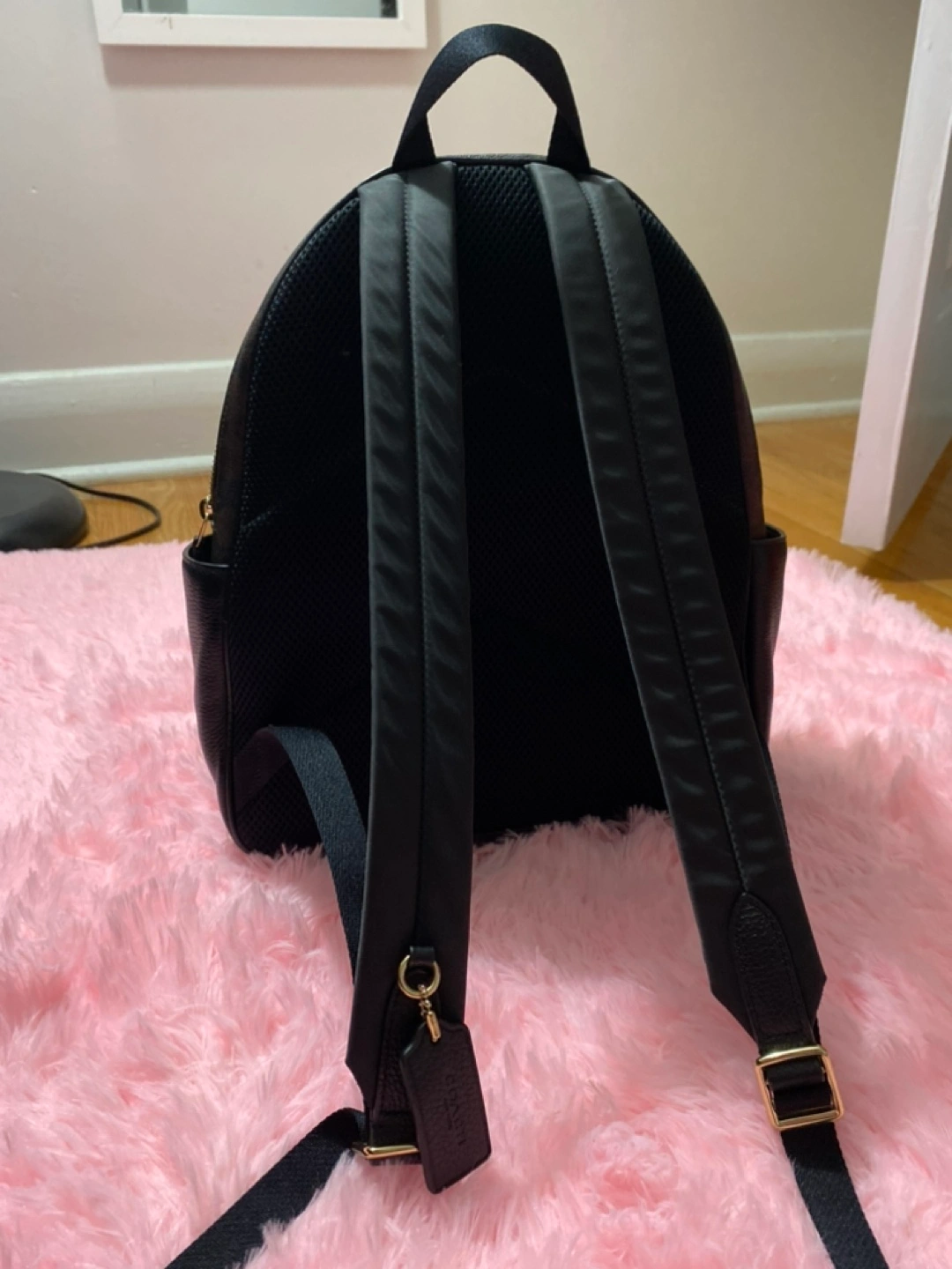Brown and black signature Coach backpack with gold hardware. Has one large compartment and a small front pocket with a zipper. Includes an adjustable strap for shoulder carrying.