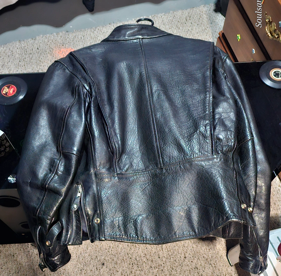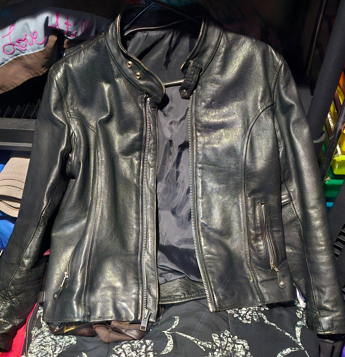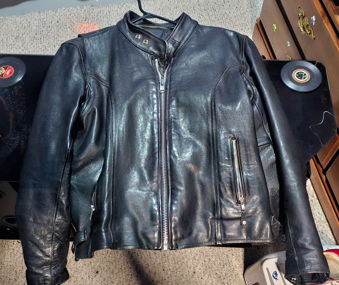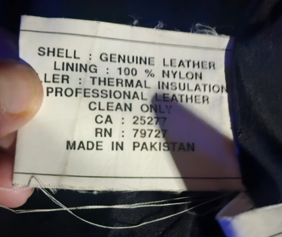 Black leather jacket with a zipper closure. It has two zippered pockets on the front . The jacket is lined with 100% nylon. It is made in Pakistan and is in good condition.