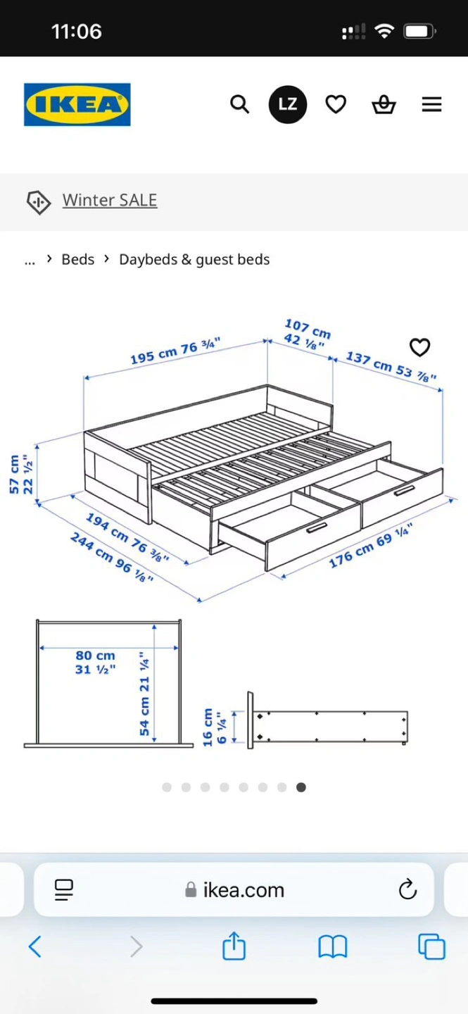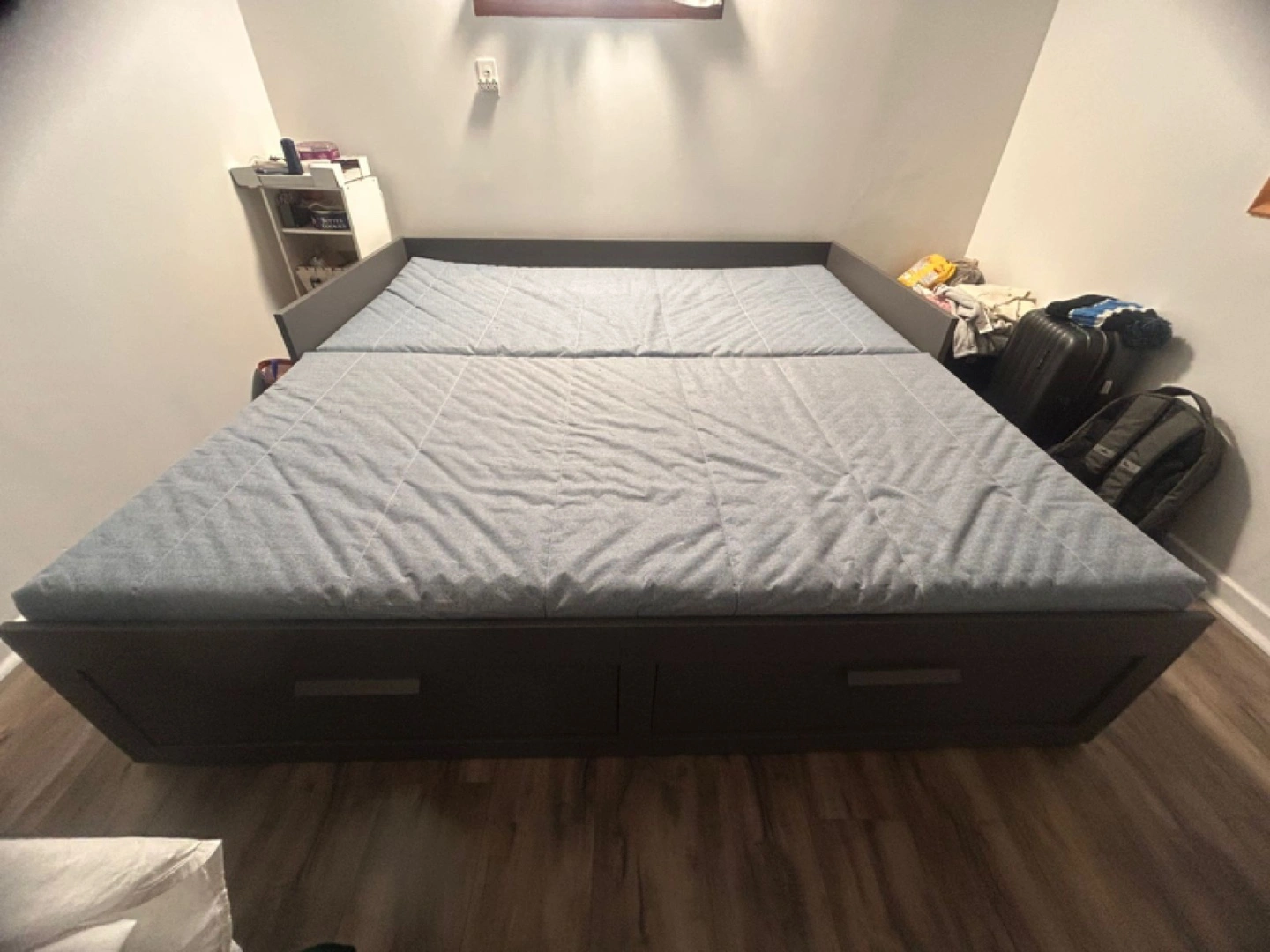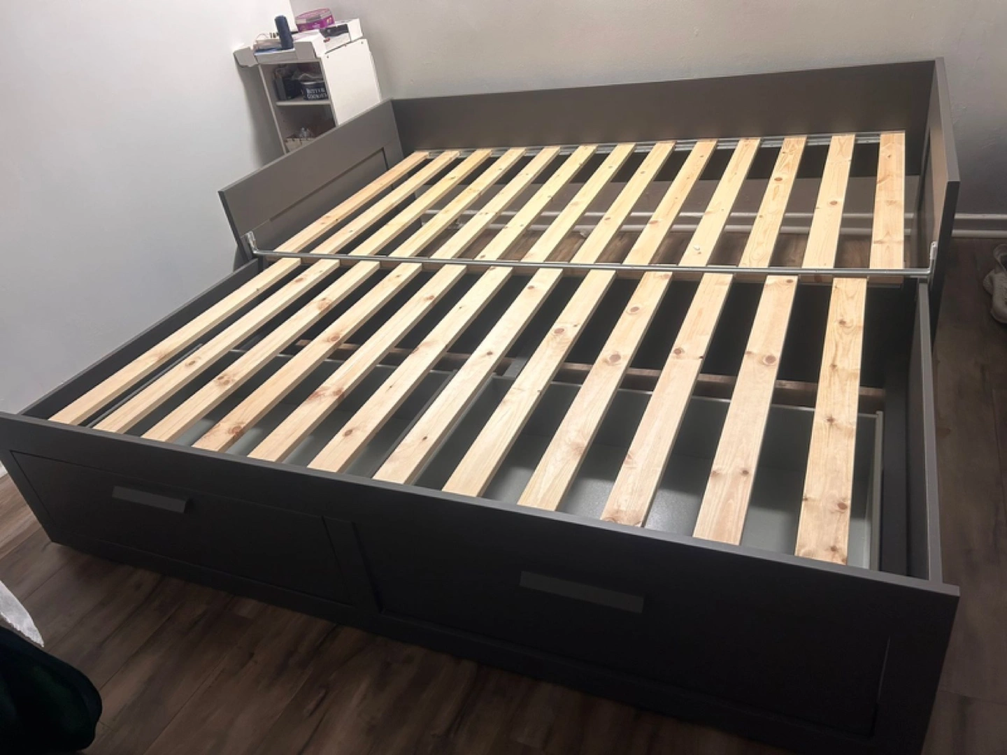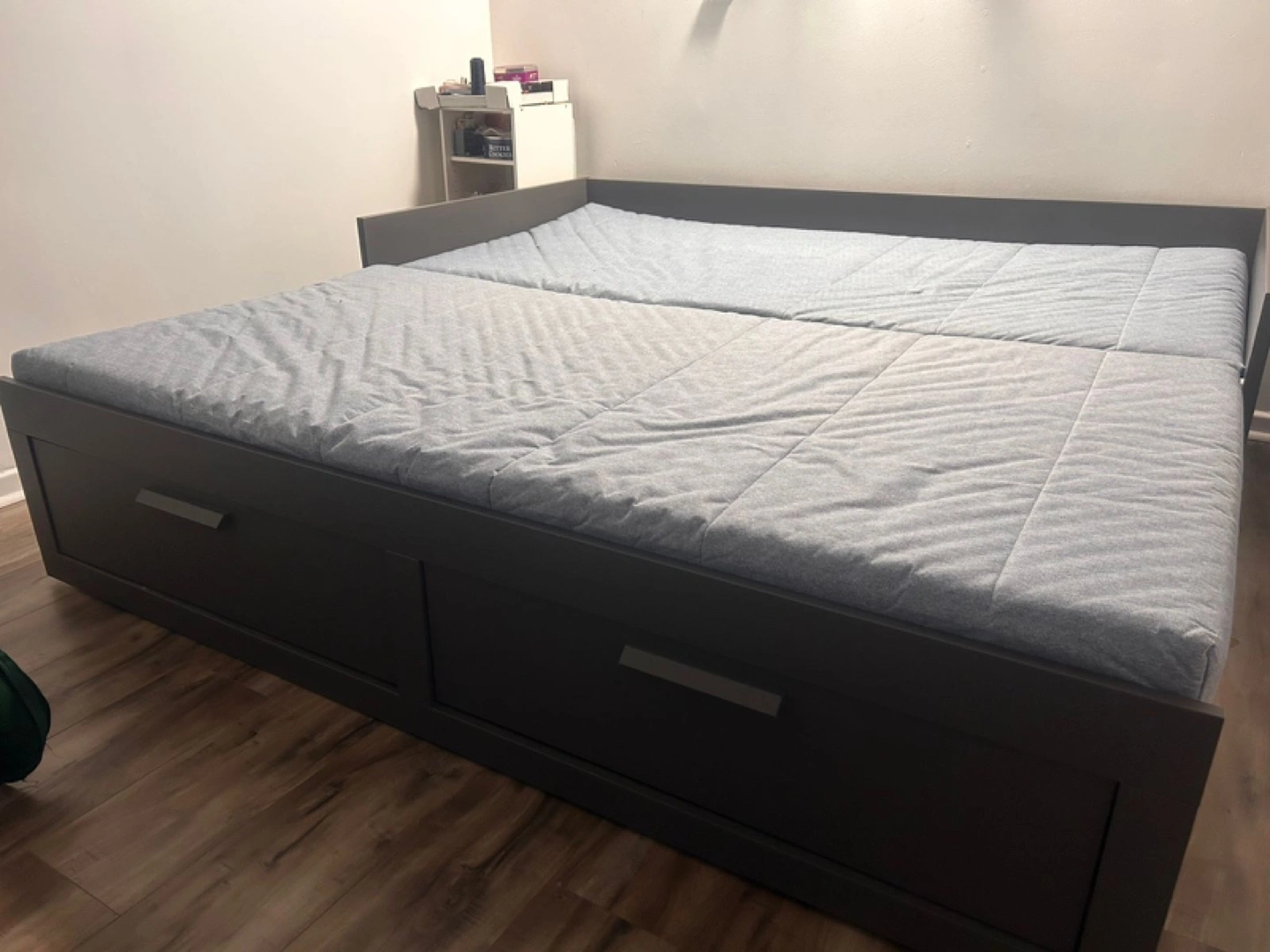 A sofa by day and a bed for one – or two – by night. The two large drawers give plenty of space for duvets, pillows and bed linen. A smart solution when you live in a small space. Very good conditions, disassembled.
