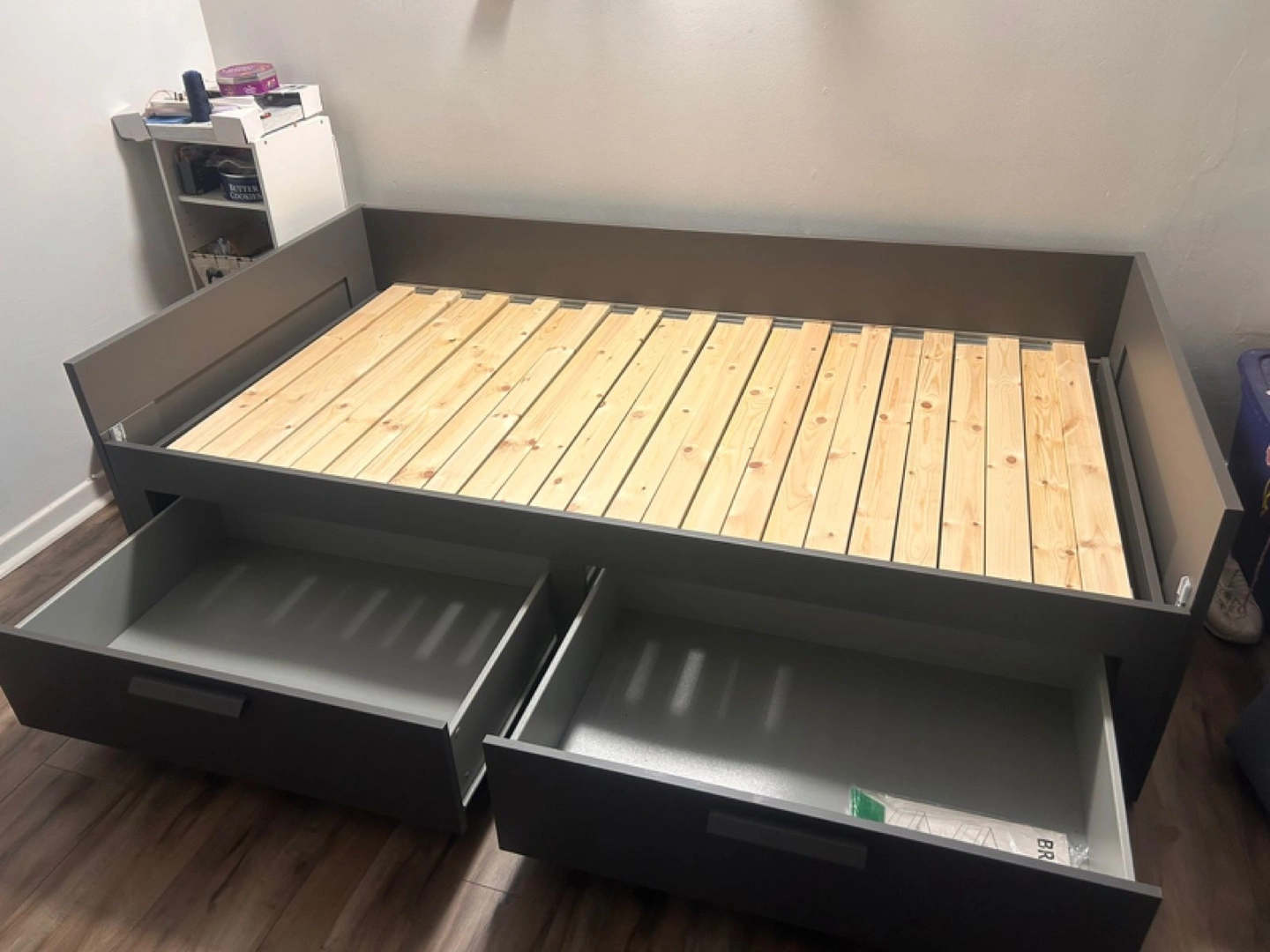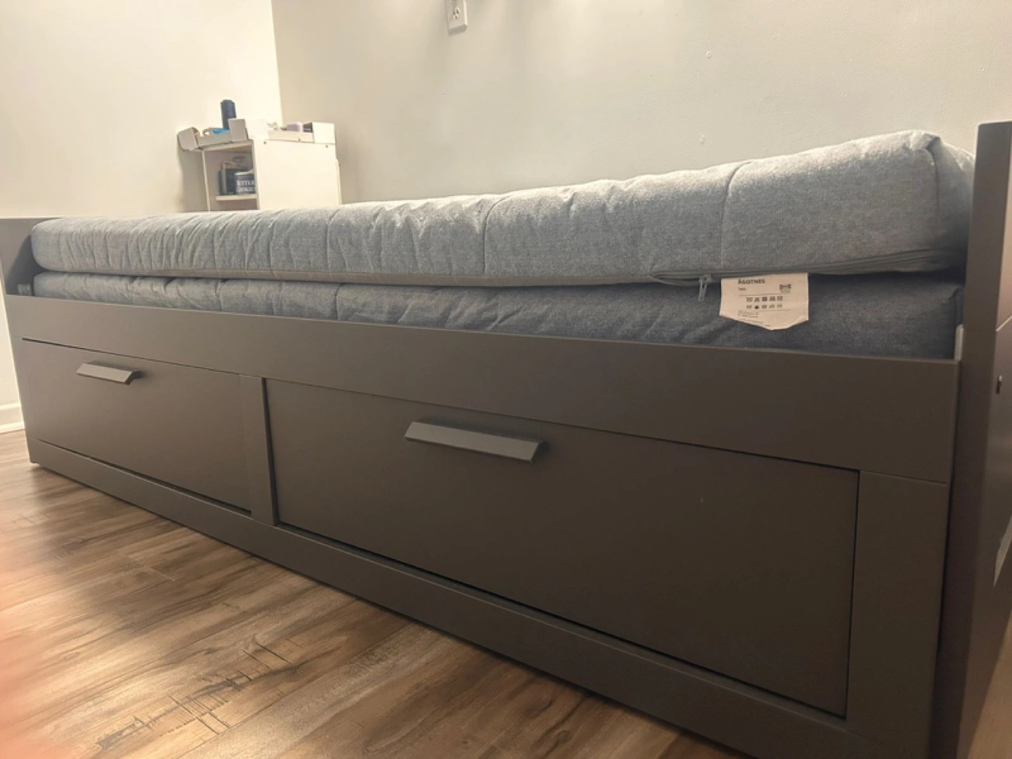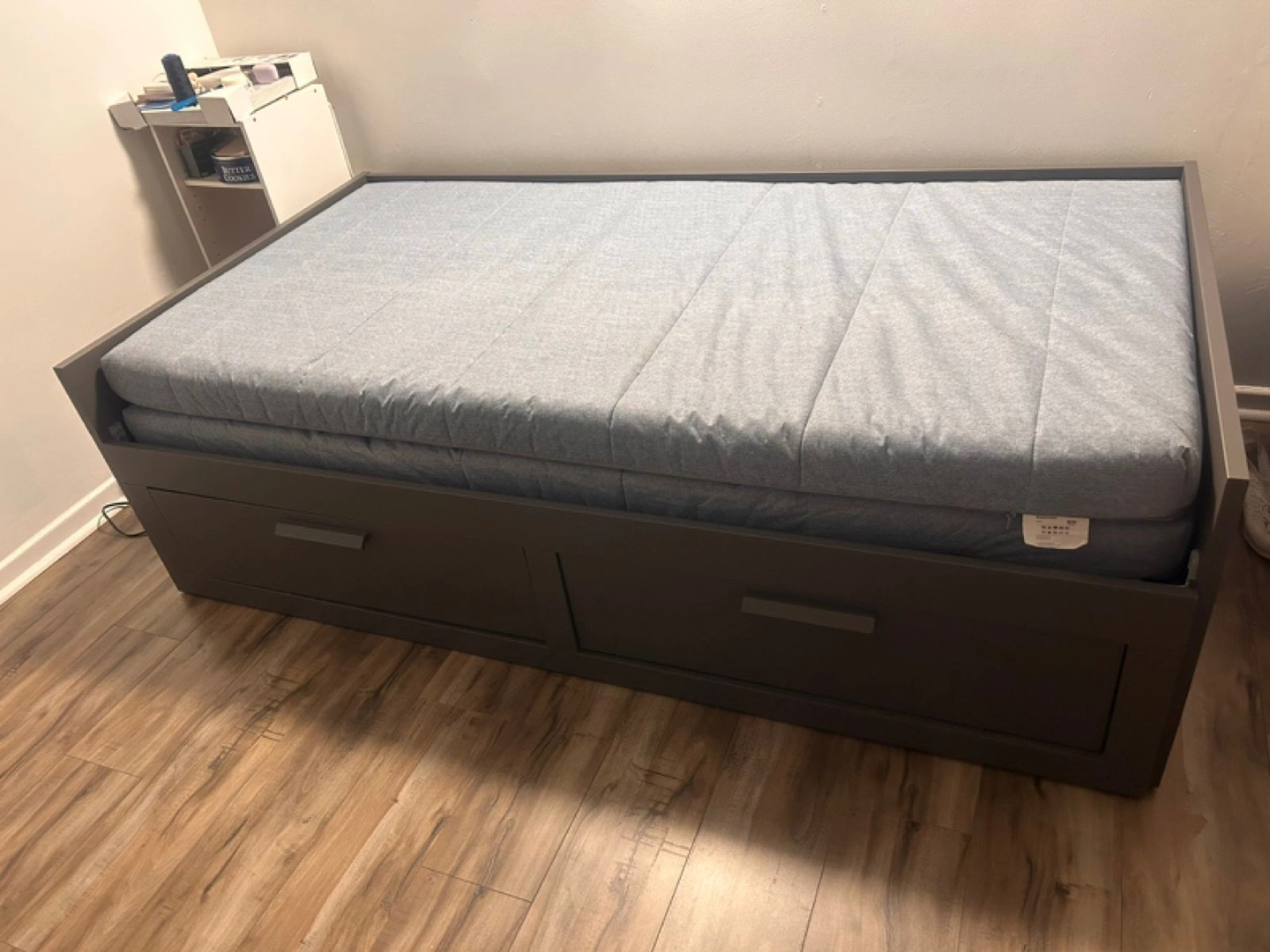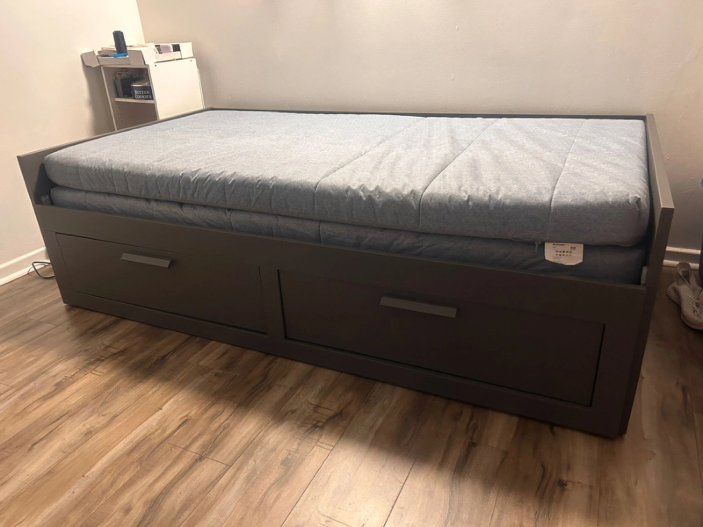 A sofa by day and a bed for one – or two – by night. The two large drawers give plenty of space for duvets, pillows and bed linen. A smart solution when you live in a small space. Very good conditions, disassembled.