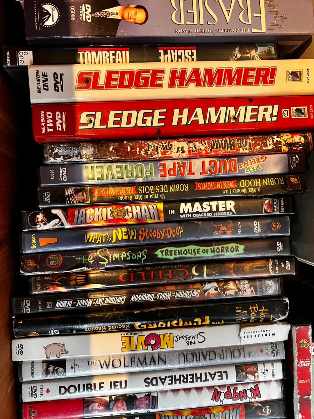 Collection of 15 DVDs, titles include: Frasier, Sledge Hammer, Robin Hood Men in Tights, Jackie Chan Master, The Simpsons, Sky Captain and the World of Tomorrow, The Wolfman, Kingpin, Leatherheads.