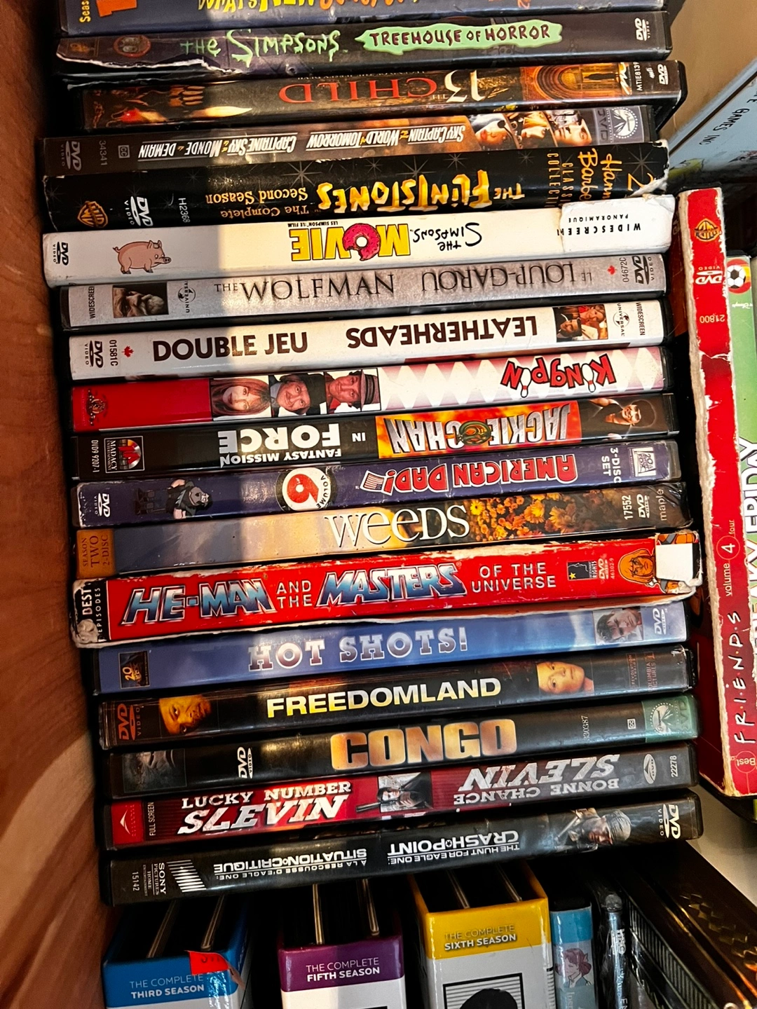 Collection of 16 DVDs. Includes titles like *He-Man and the Masters of the Universe*, *Hot Shots*, *Freedomland*, *Congo*, *Lucky Number Slevin*, *Crashpoint*, *American Dad*, *Kingpin*, *Leatherheads*, *Double Jeu*, *Loup-Garou*, *The Simpsons Movie*, *The Flintstones*, *Sky Captain and the World of Tomorrow* and more.