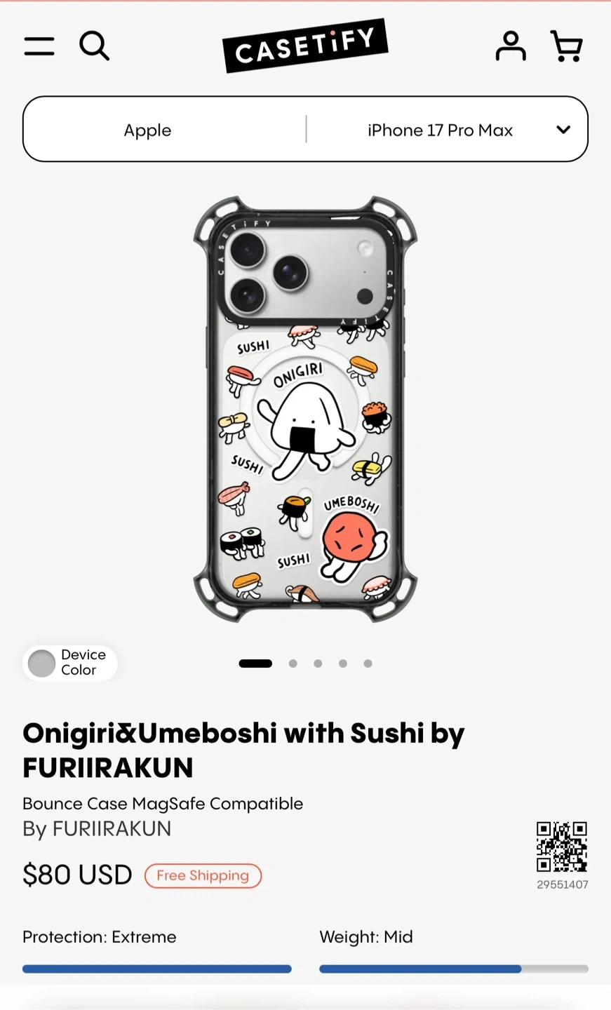 Selling a Casetify Bounce Case MagSafe Compatible for iPhone 17 Pro Max featuring the Onigiri&Umeboshi with Sushi design by FURIIRAKUN! The case offers extreme protection and is of mid weight. Originally listed for $80 USD.