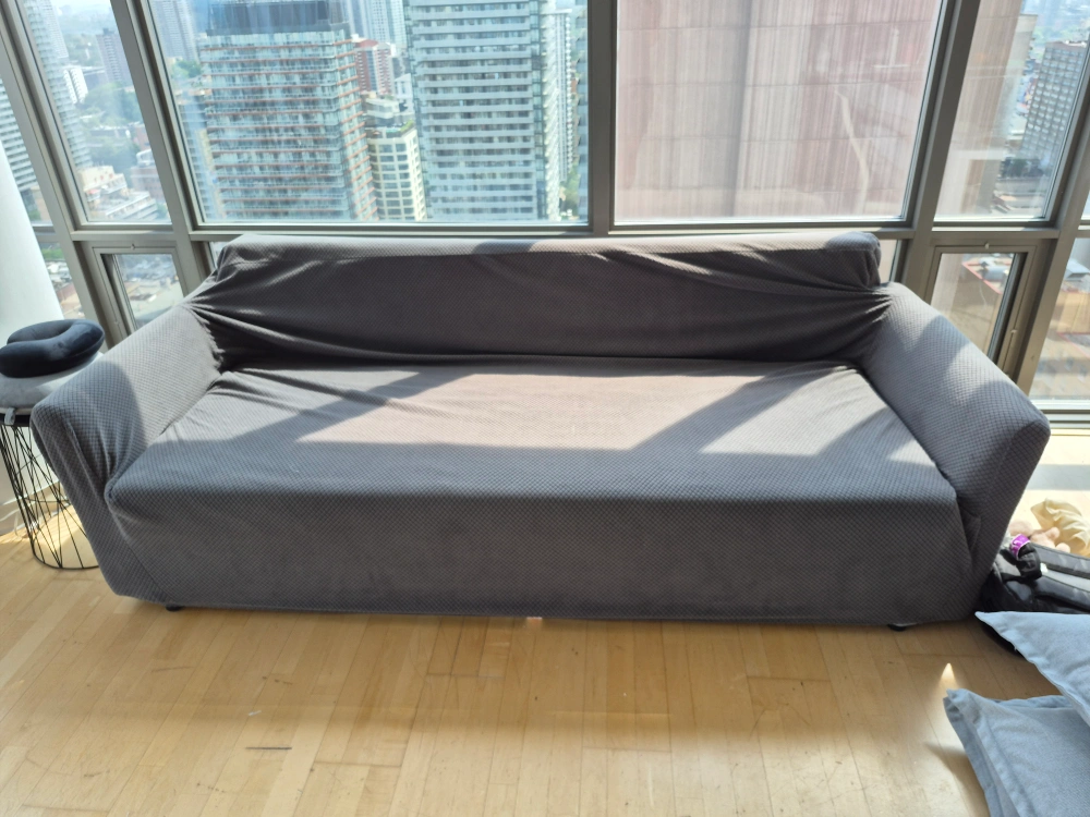 Selling a 3 seat grey sofa cover. It covers the entire sofa . It's completely waterproof and in great condition.. was used for less than a year in a smoke and pet free house.
