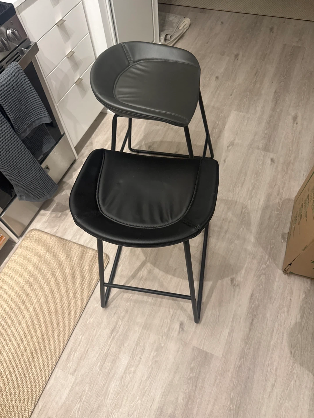 Two black bar stools with faux leather seats and metal frames. These are great for a kitchen island or a bar area. The stools are designed for comfortable seating.