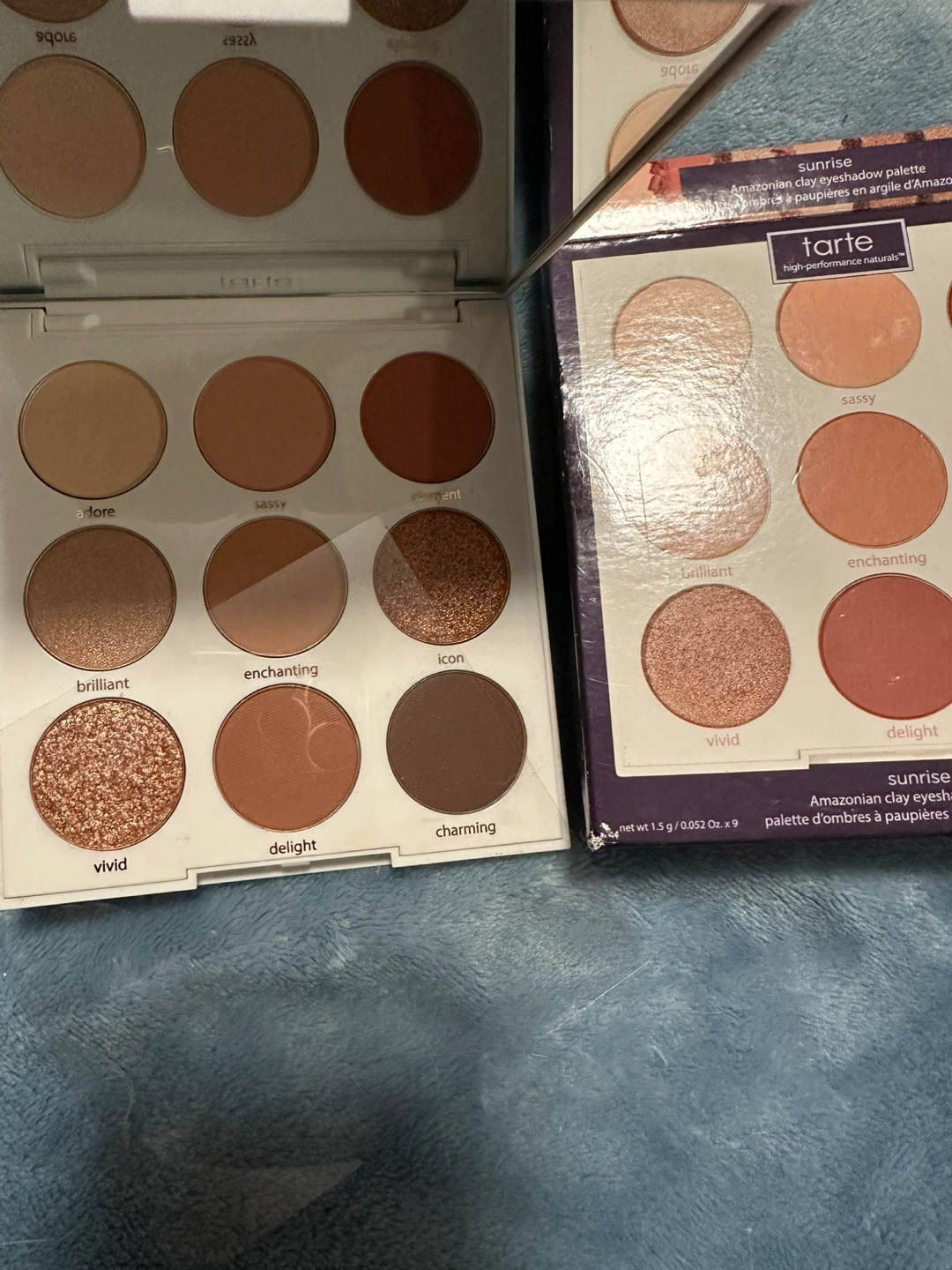 Selling a Tarte Sunrise Amazonian Clay Eyeshadow Palette! It includes a variety of shades like adore, sassy, brilliant, enchanting, vivid, delight, and charming. Perfect for creating different looks!