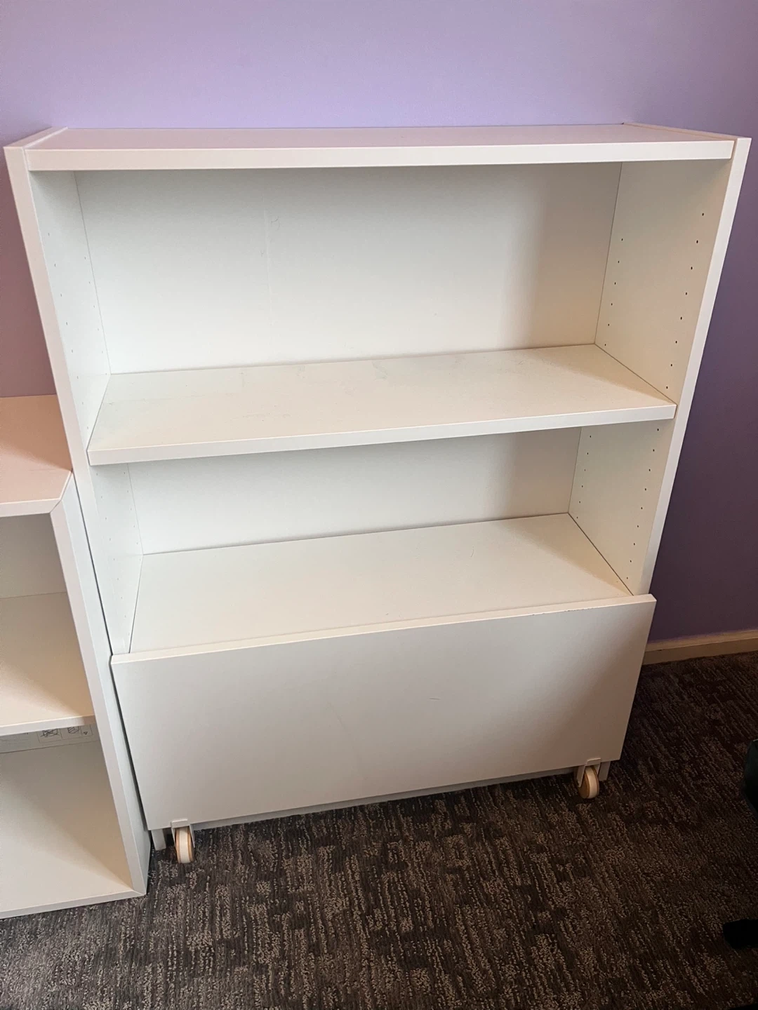 White bookshelf with three shelves. It has a bottom drawers compartment with roller wheels.