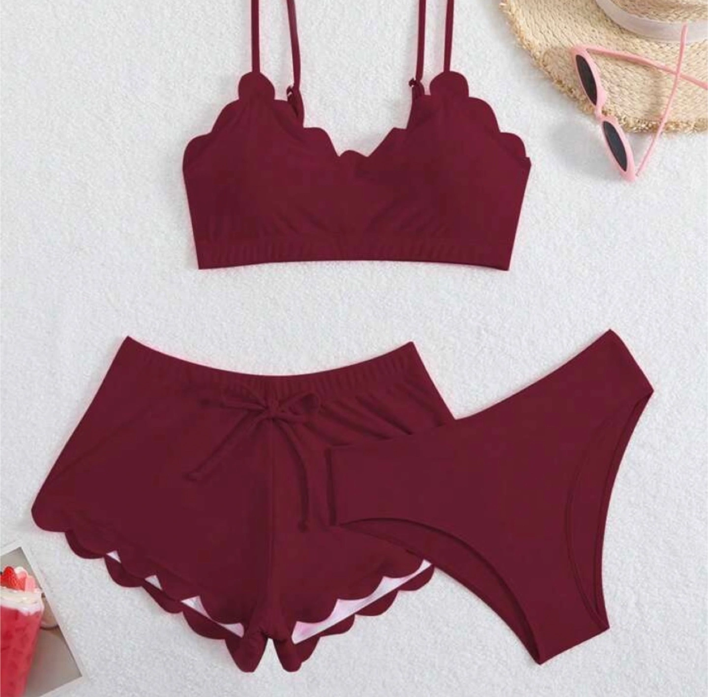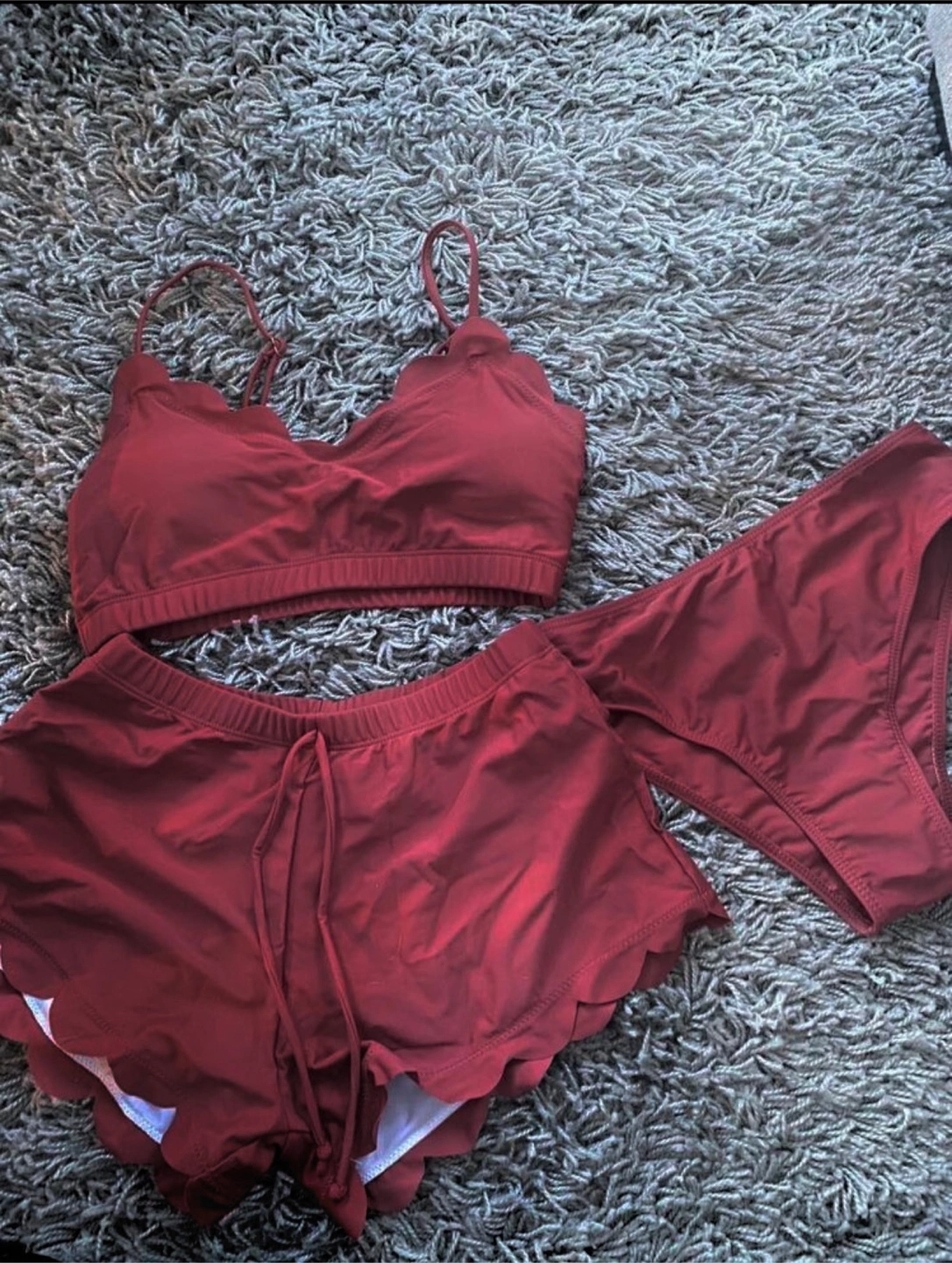 Selling a cute burgundy swimsuit set! It includes a bralette-style top, shorts with a drawstring, and bikini bottoms. Perfect for the summer