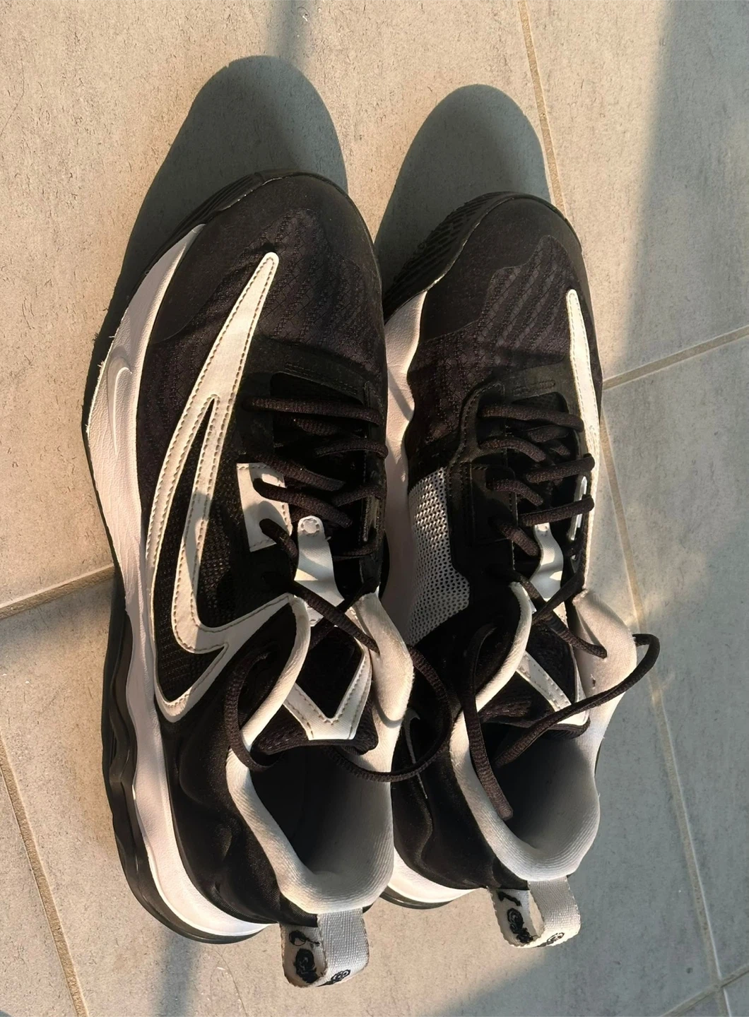 Black and white Nike basketball shoes. Lace-up closure. These shoes are built for performance on the court. They're designed for grip and support.