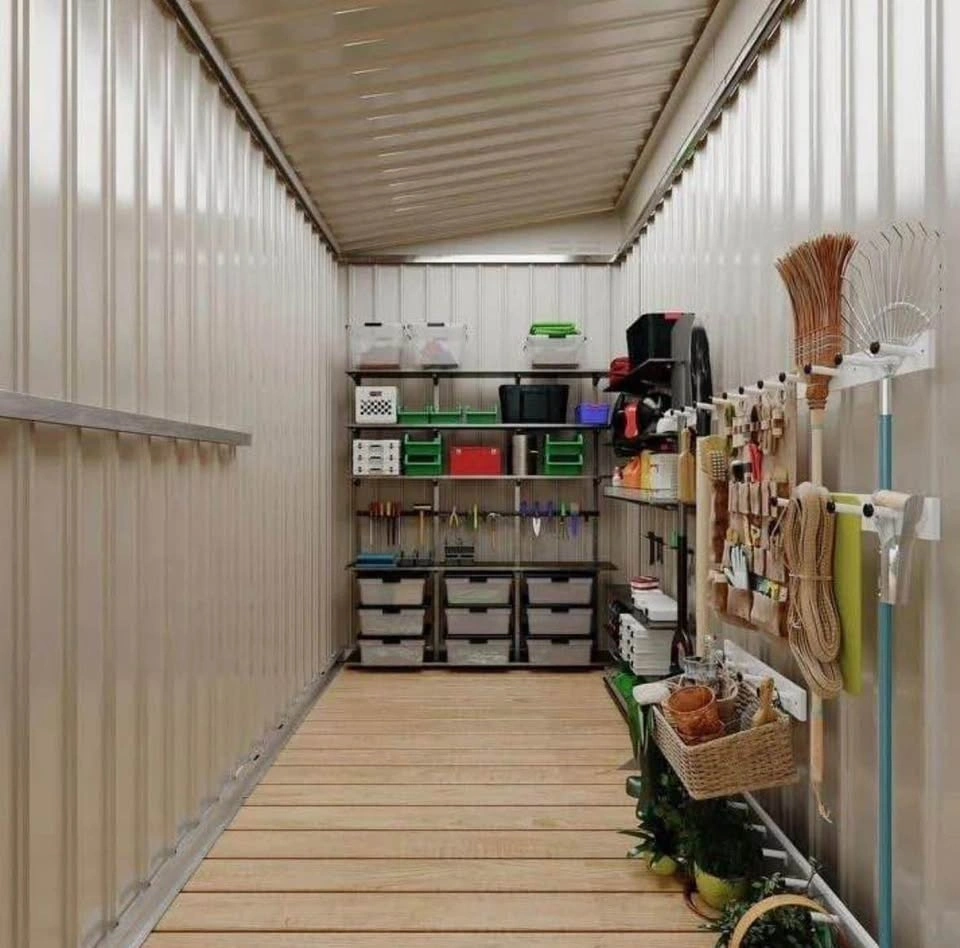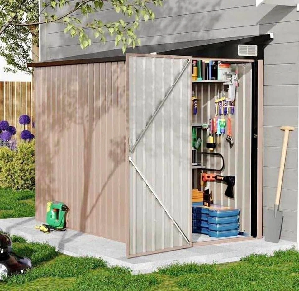 Brand new, factory-sealed 4x8 ft metal storage shed (ES46628). Made from heavy-duty galvanized steel, it's corrosion-resistant and wind-rated up to 70 mph. Features front & rear air vents, secure lockable double doors, and a space-saving lean-to design with a sloped roof for fast water drainage. Perfect for bikes, lawn equipment, tools, pet shelter, or garbage storage. Color: Brown | Weight: 108 lbs. Pickup: Hurontario & Sandalwood.