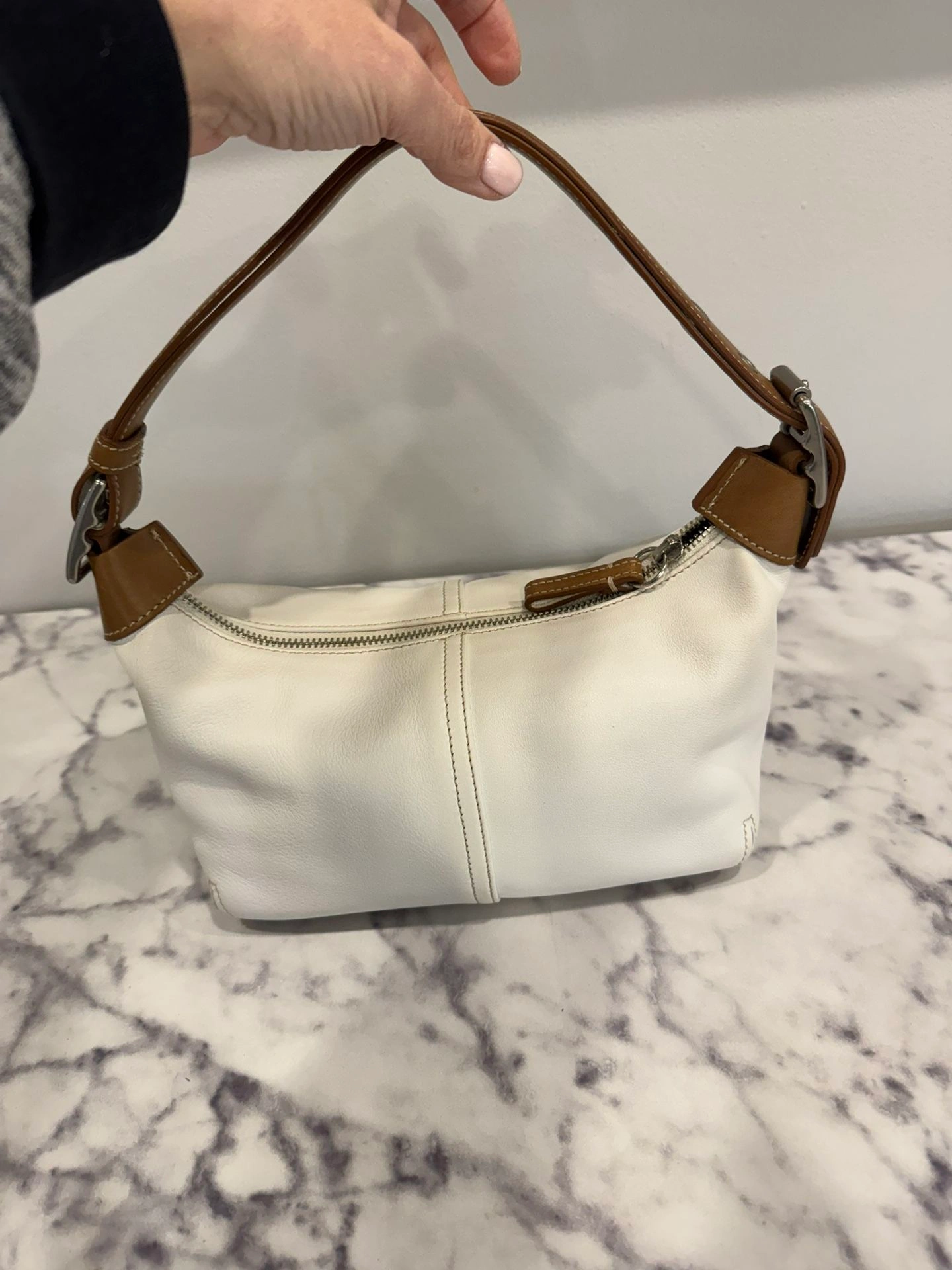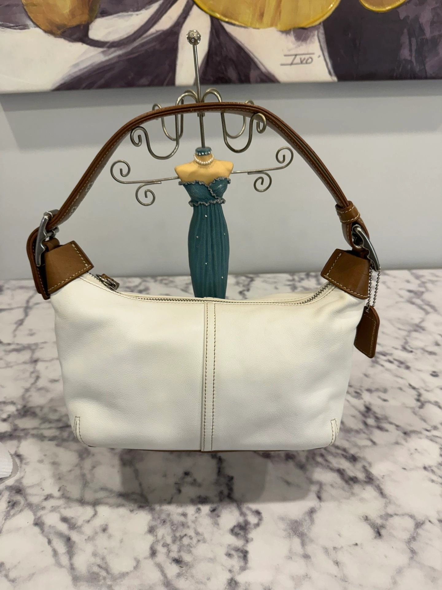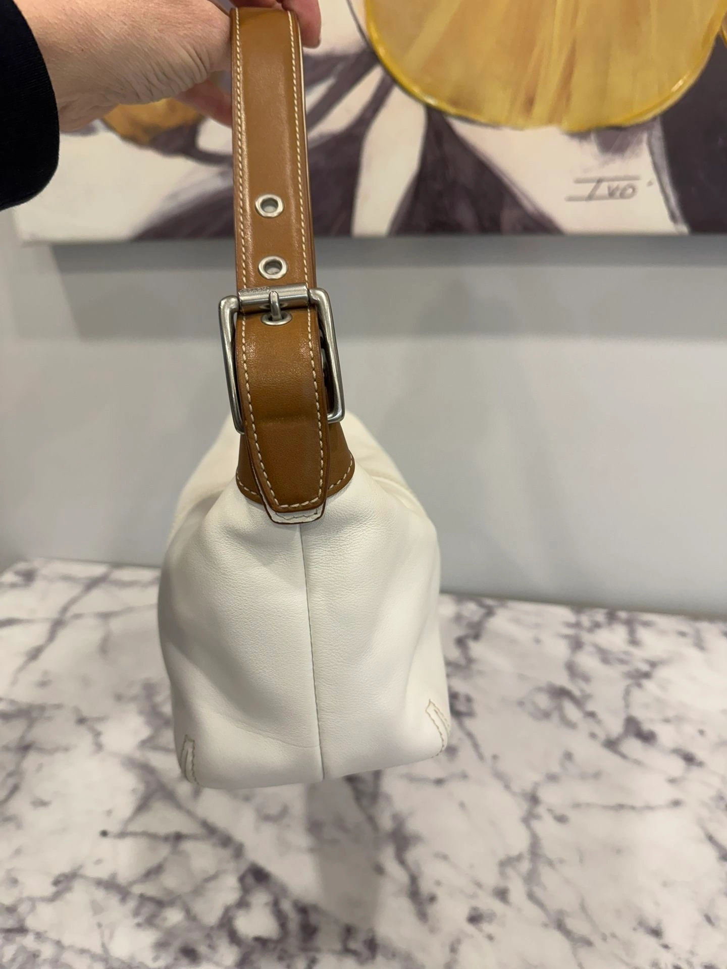 Coach Legacy Demi Hobo bag, style 9564. Crafted in white leather with a classic tan strap. Sleek, minimalist design with top zip closure and spacious interior. Produced around 2003. Excellent vintage condition.