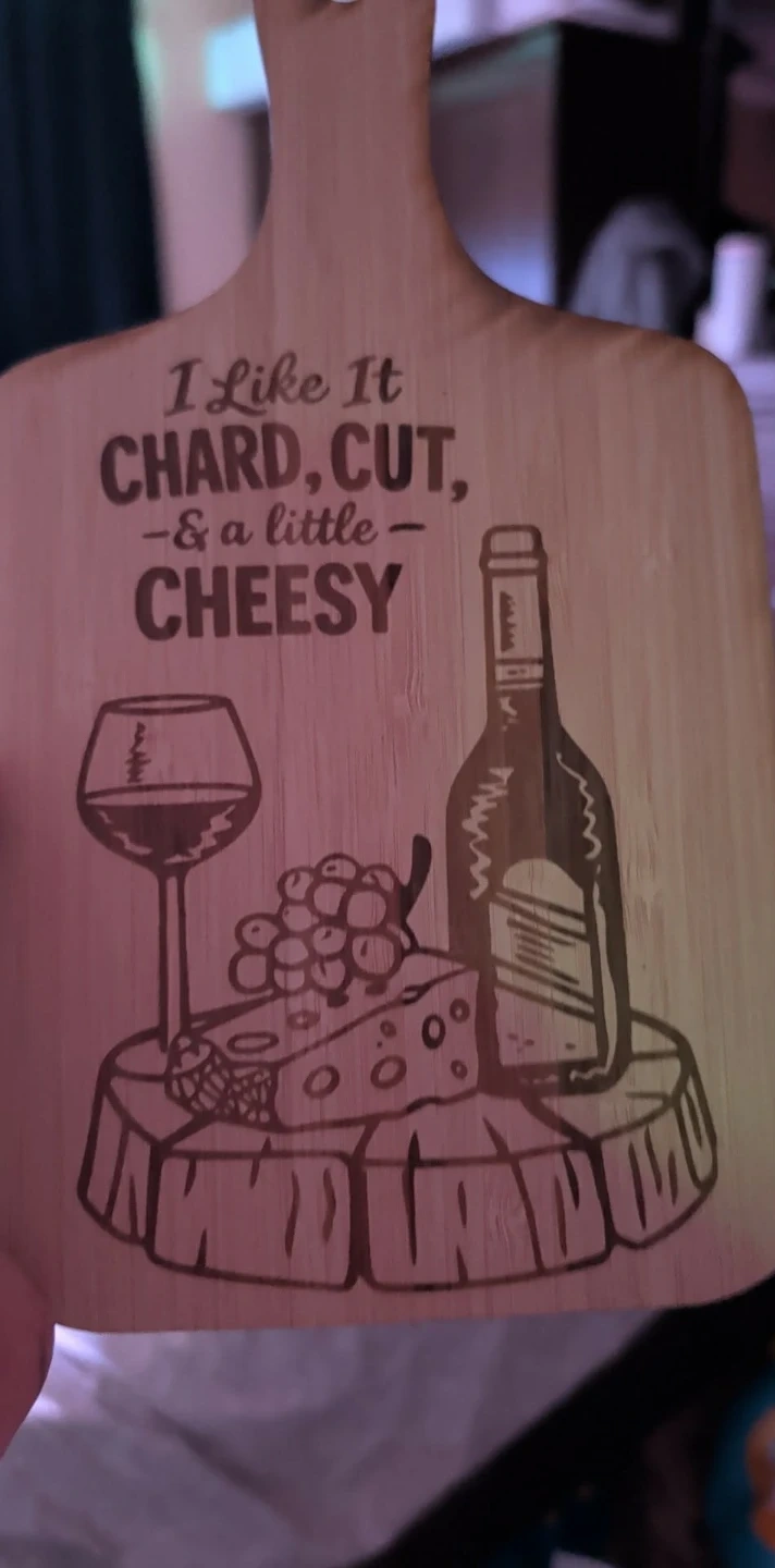 Bamboo cheese board with a fun engraved design. "I Like It CHARD, CUT, - & a little CHEESY" text is shown with a wine bottle, grapes, and cheese. Great for serving appetizers!