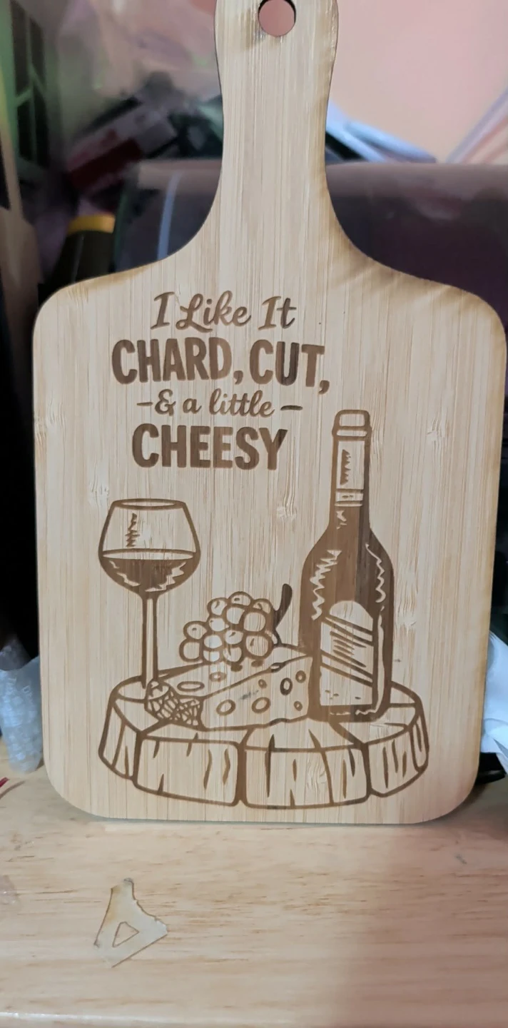 Bamboo cheese board with a fun engraved design. "I Like It CHARD, CUT, - & a little CHEESY" text is shown with a wine bottle, grapes, and cheese. Great for serving appetizers!