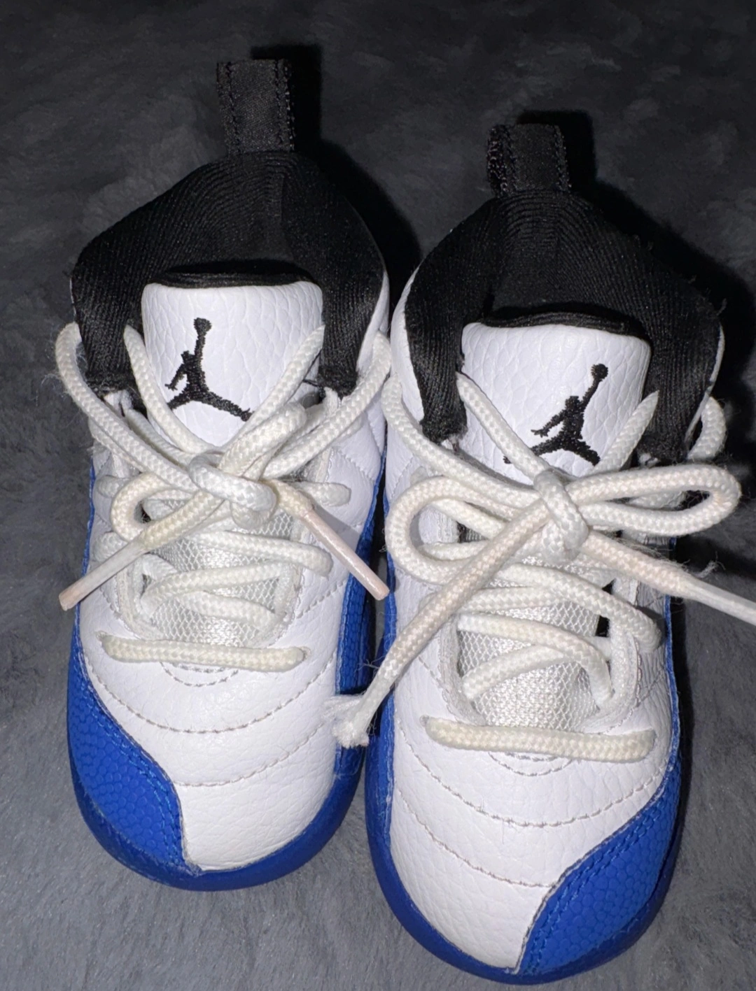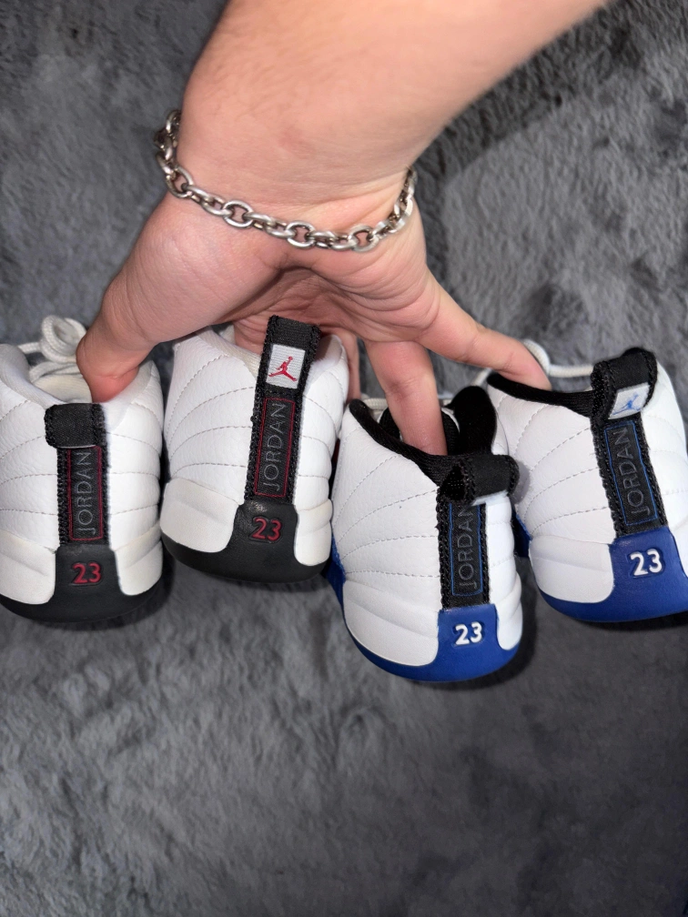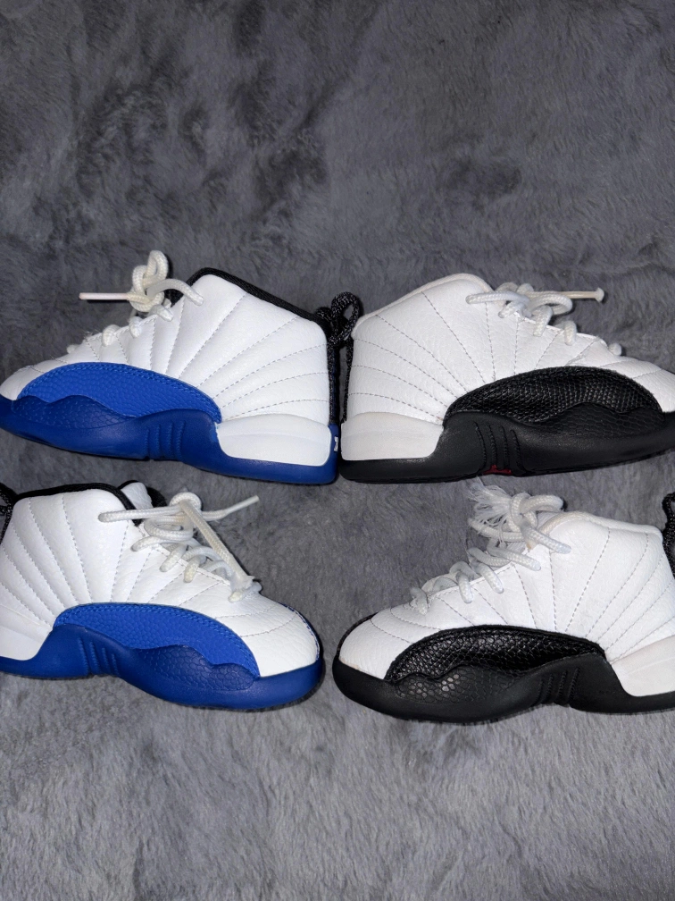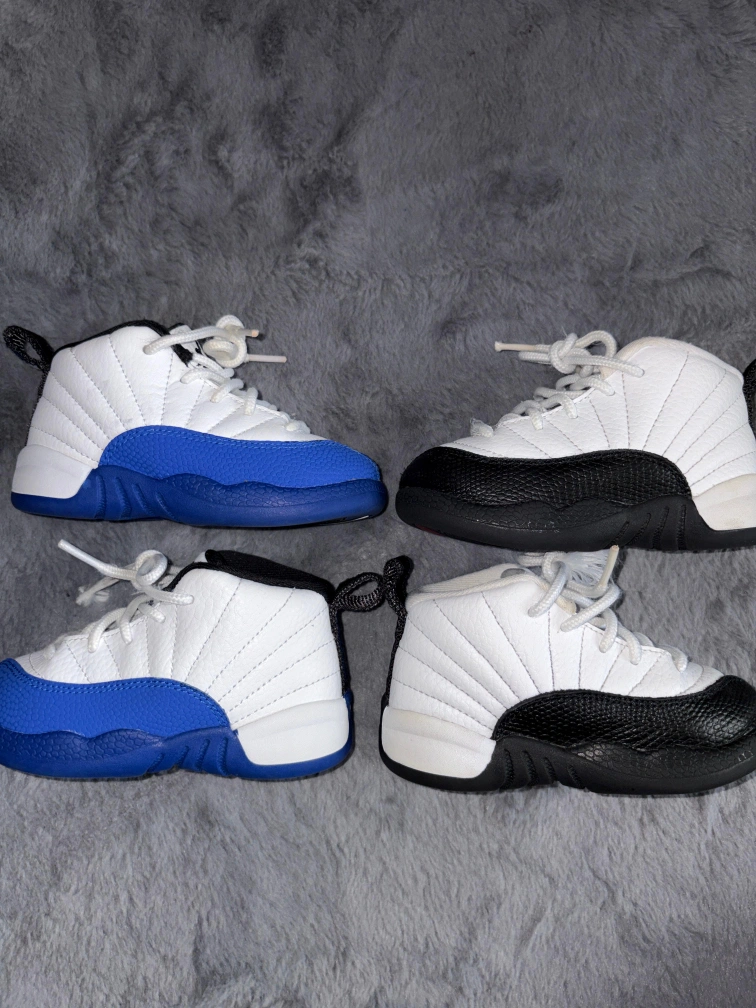 Two pairs of toddler Air Jordan 12 Retro shoes. One pair is in a royal blue and white colorway, and the other is in black and white. These iconic sneakers feature the classic '23' on the heel.