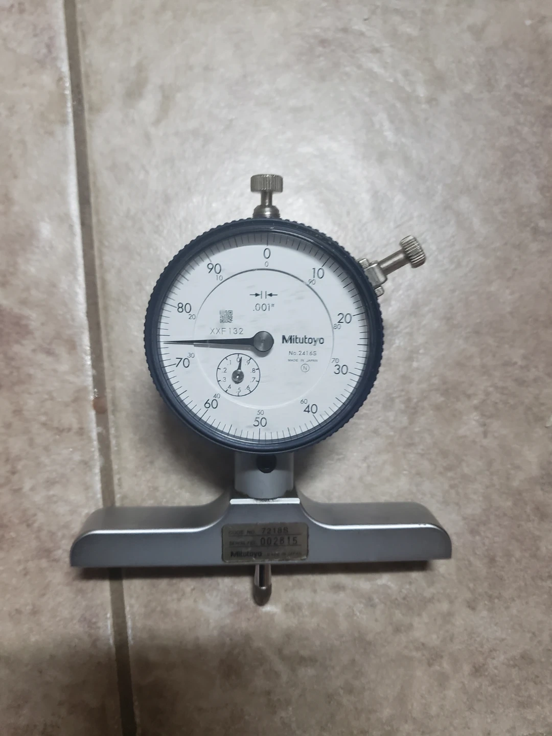 Mitutoyo dial indicator depth gauge. Features a .001" dial reading and a durable metal base. Includes original serial number 002815. This is a precision measuring tool for various applications.