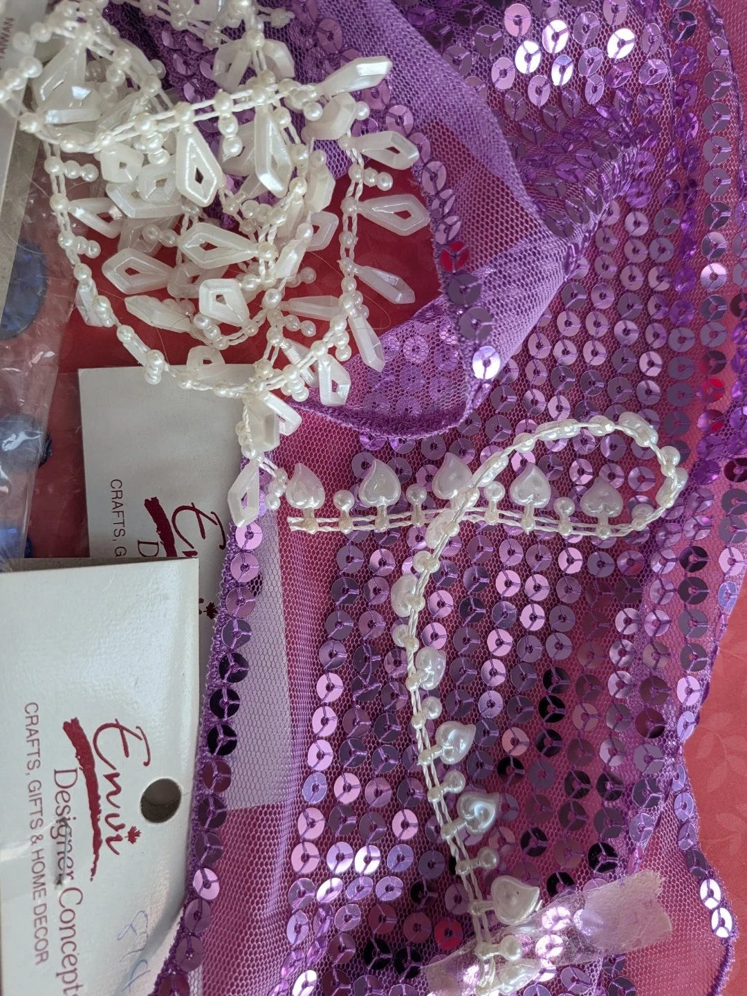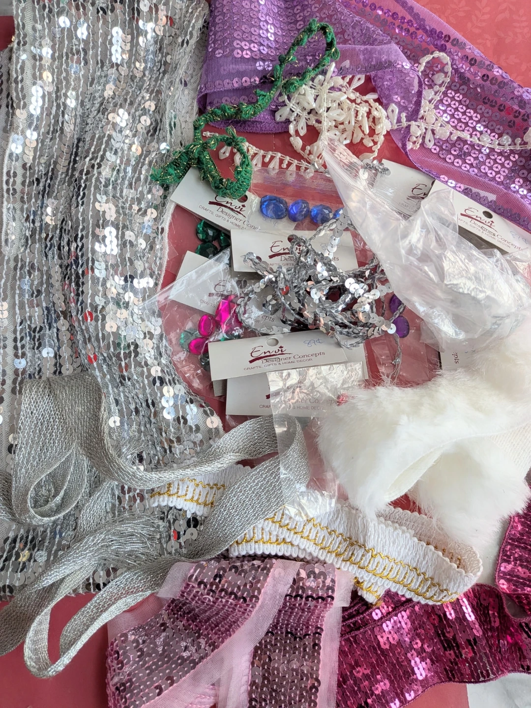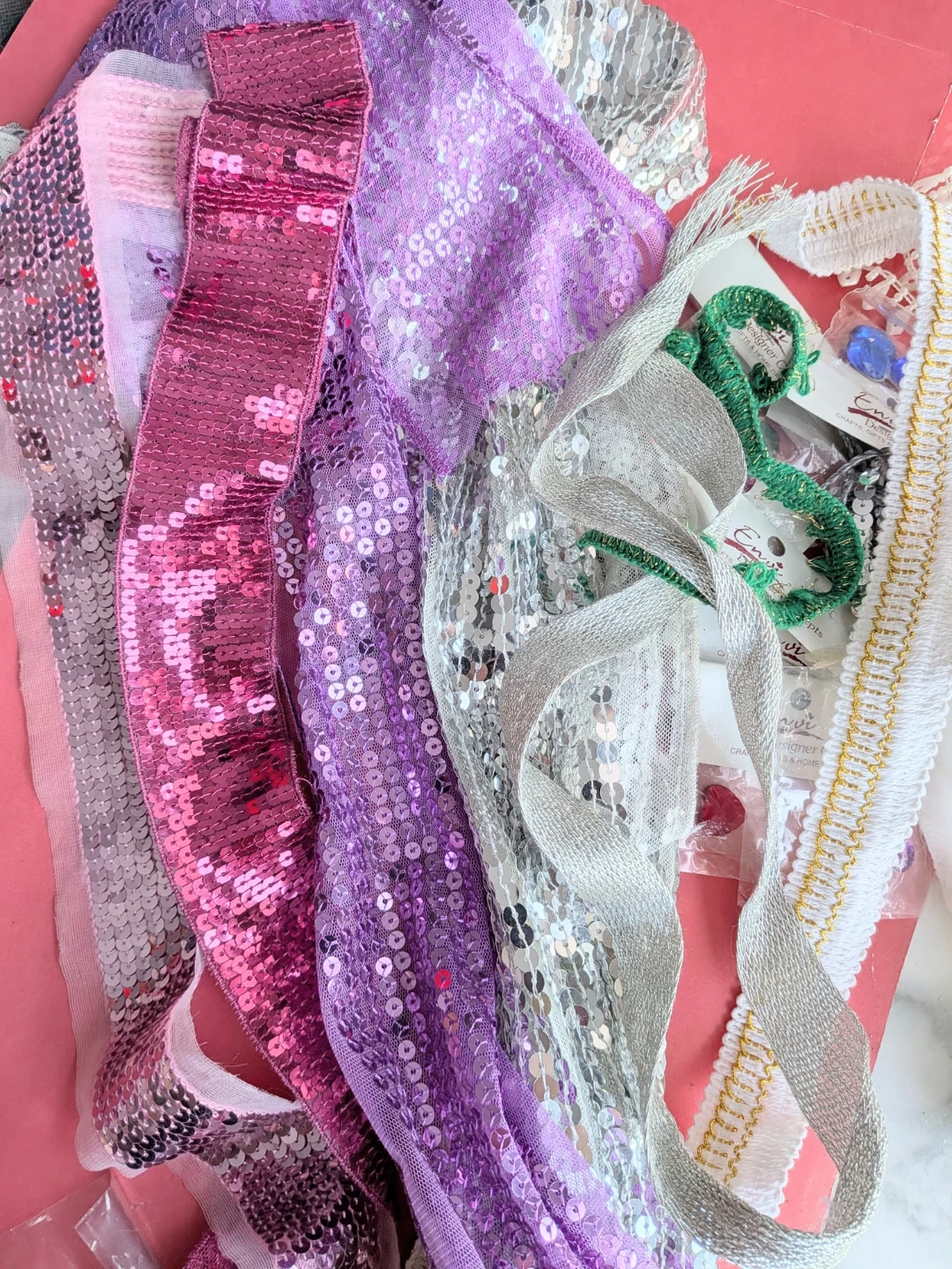 A collection of craft embellishments including sequins, beads, rhinestones, and trims. Perfect for DIY projects and garment decoration!