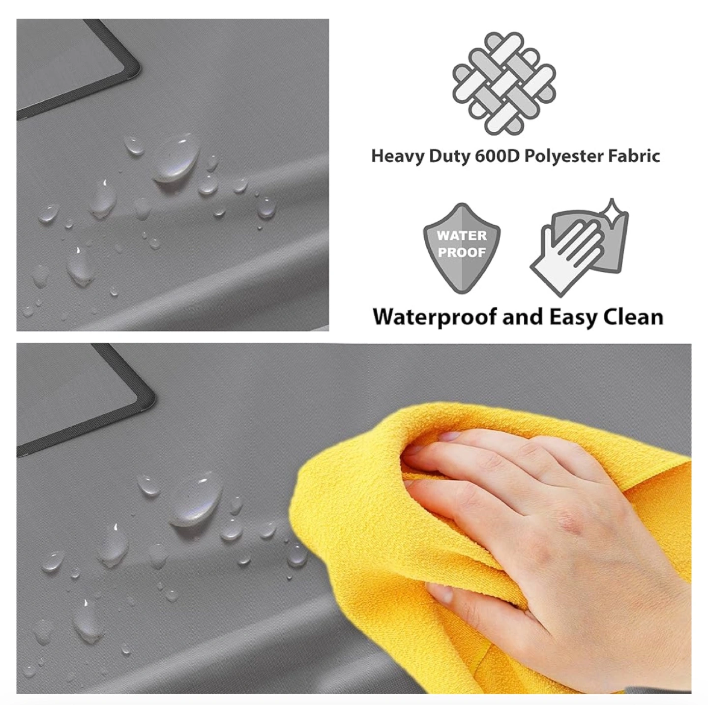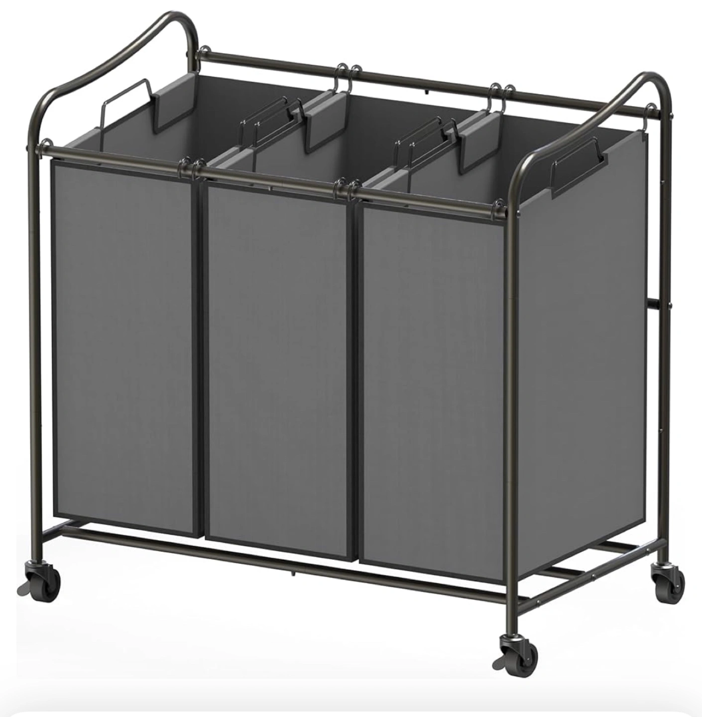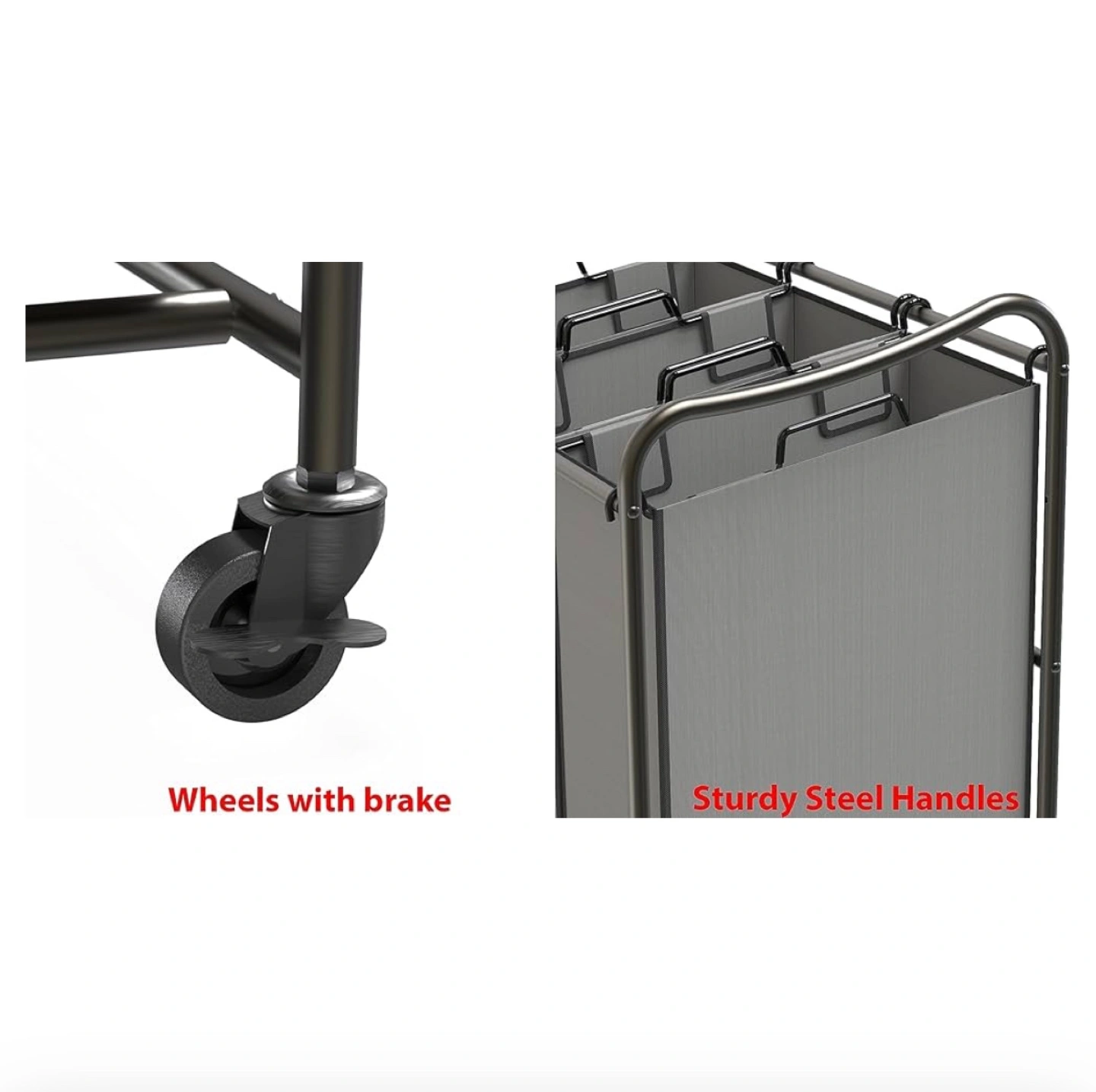 Three-bag laundry sorter. Rolling cart design. Durable steel frame. Grey fabric bags. Wheels with brakes. Easy to clean. Waterproof. Heavy-duty polyester.