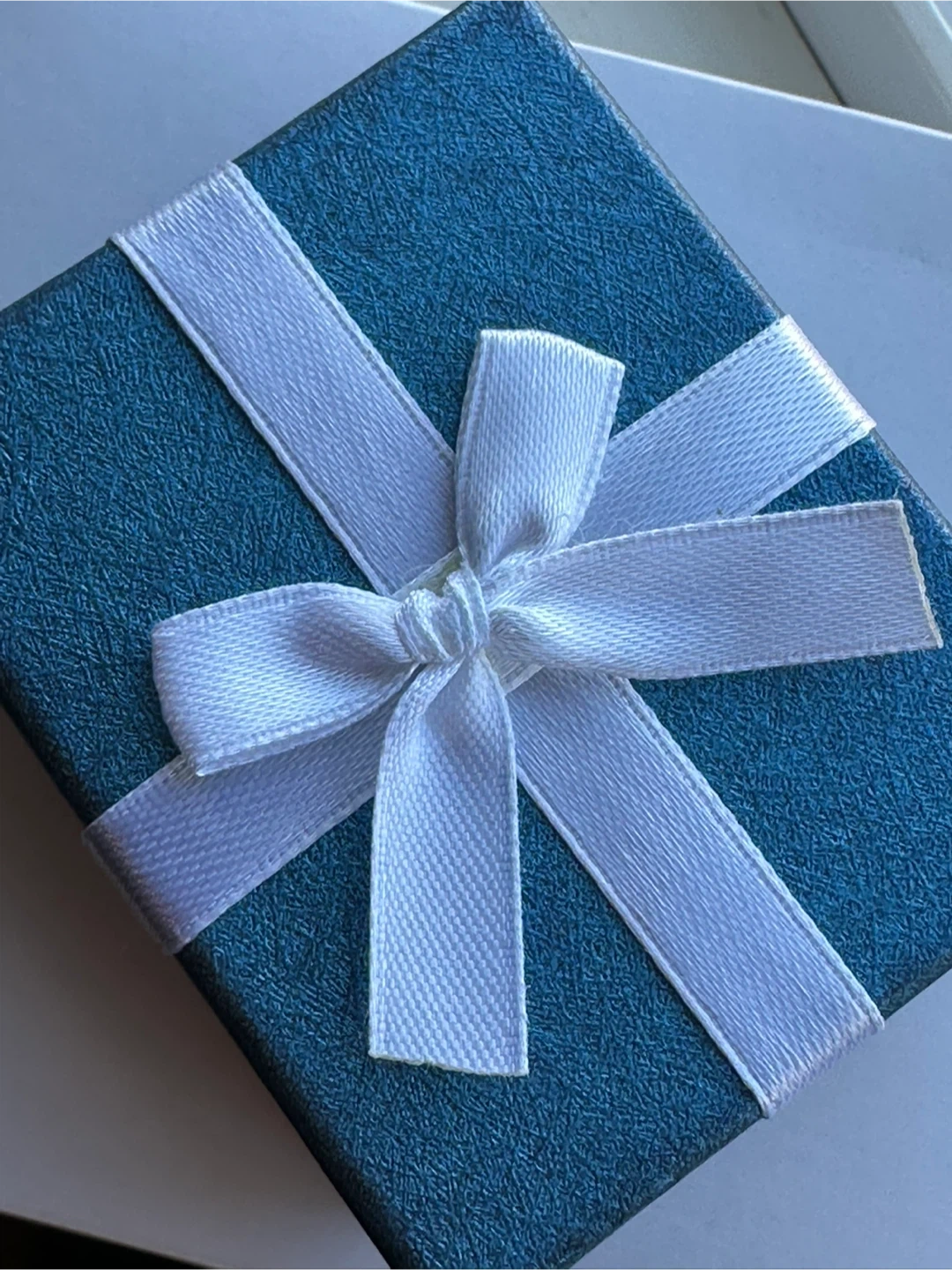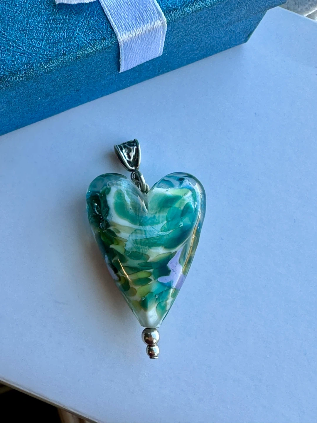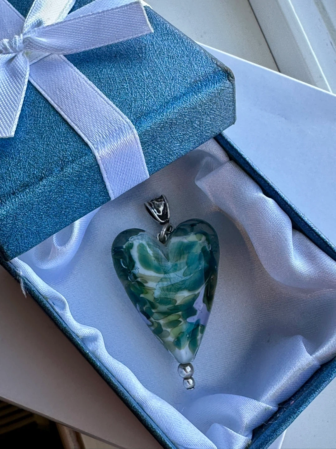 Beautiful heart-shaped pendant with swirls of green, white, and purple. Comes in a blue gift box.