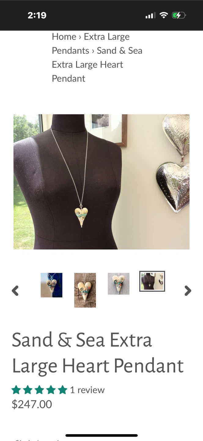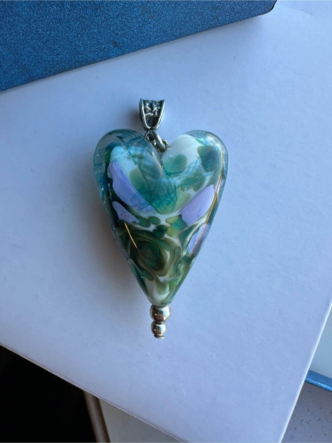 Beautiful heart-shaped pendant with swirls of green, white, and purple. Comes in a blue gift box.