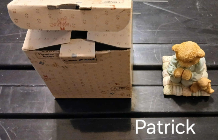 Selling a sweet Cherished Teddies figurine named "Praying for You, Patrick"! It features a teddy bear kneeling in prayer with a smaller bear beside it on a quilt. Comes with the original box from Hamilton Gifts