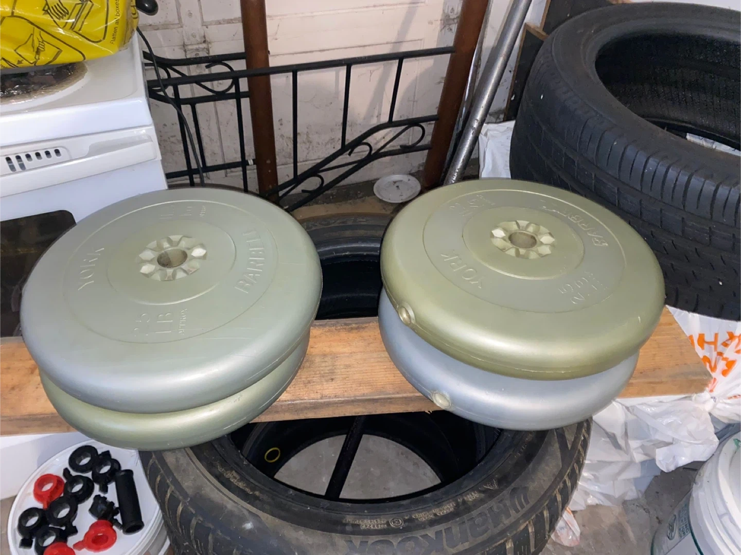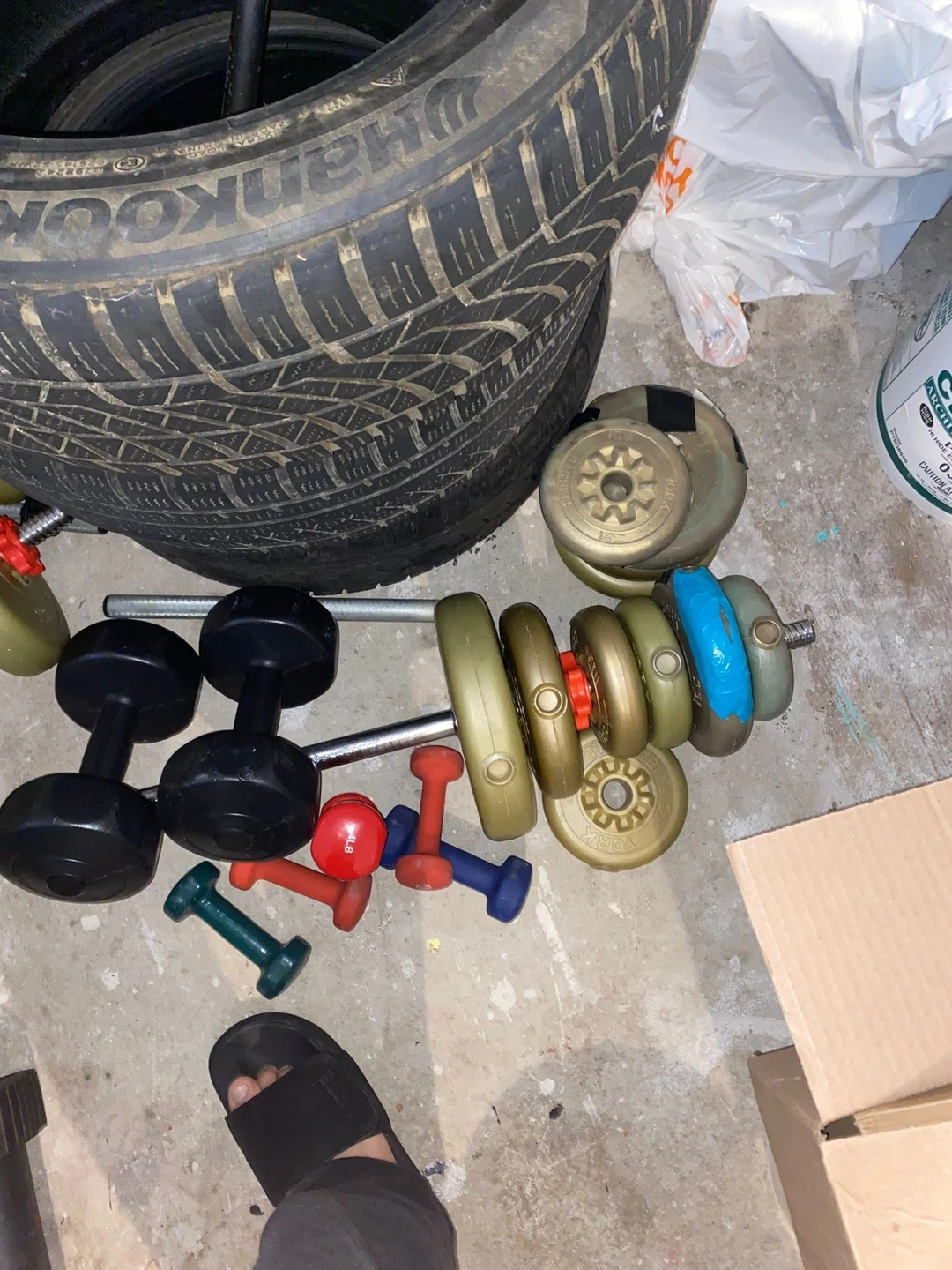 This is a York Barbell weight set that includes a curl bar and various weight plates. It's great for home workouts and building strength. The set comes with several dumbbell bars and weight plates too. Clearing up garage price negotiable