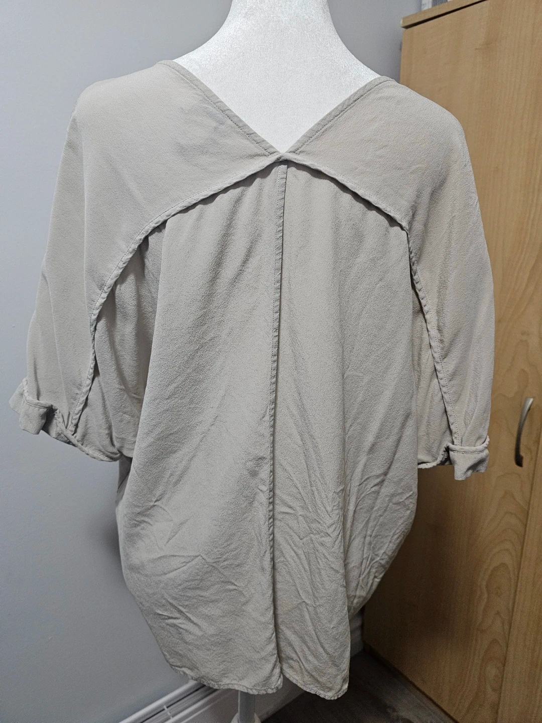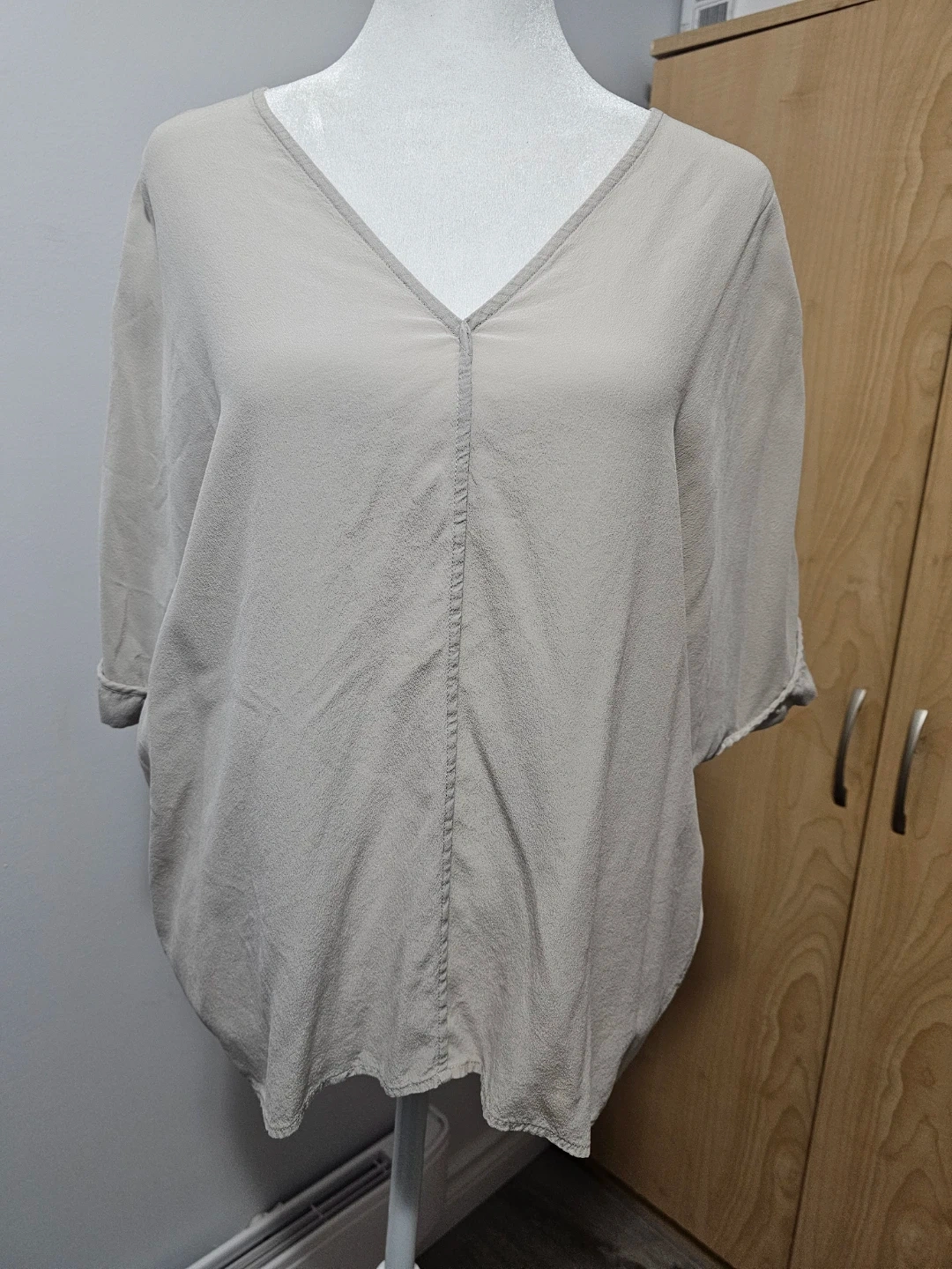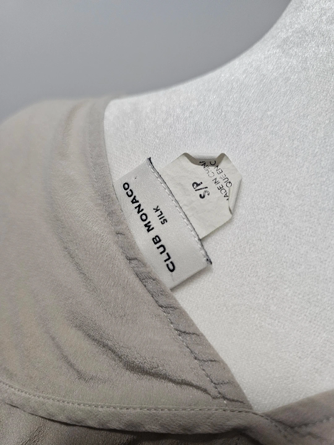 Lightweight Club Monaco top in a soft beige hue. Made from 100% silk, it features a V-neck and a relaxed fit. Size is S/P.