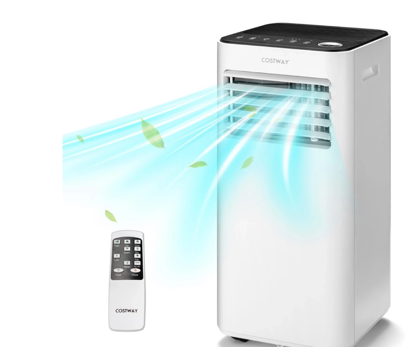 This is a Costway portable air conditioner. It comes with a remote control for easy operation. This unit is perfect for keeping a room cool on hot days.