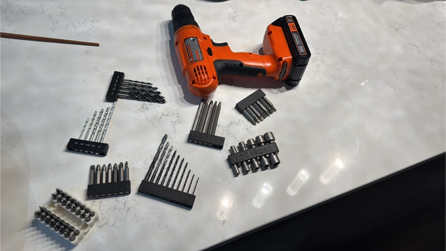 Selling a Black+Decker 20V cordless drill. It comes with a variety of drill bits and driver bits, as shown in the picture. Perfect for DIY projects around the house!