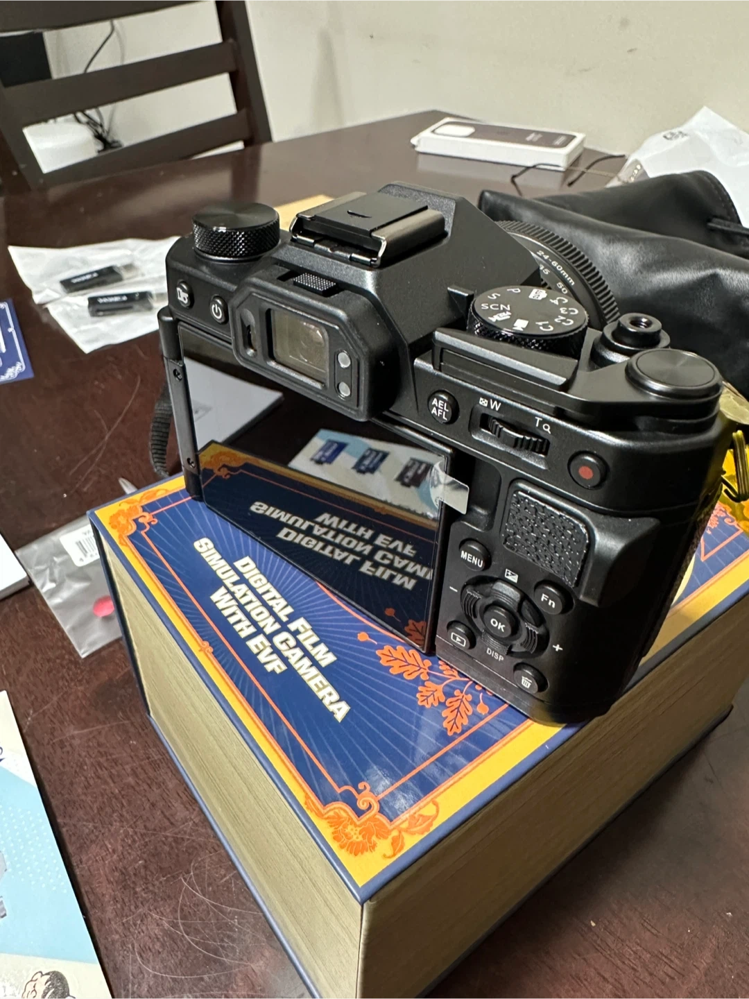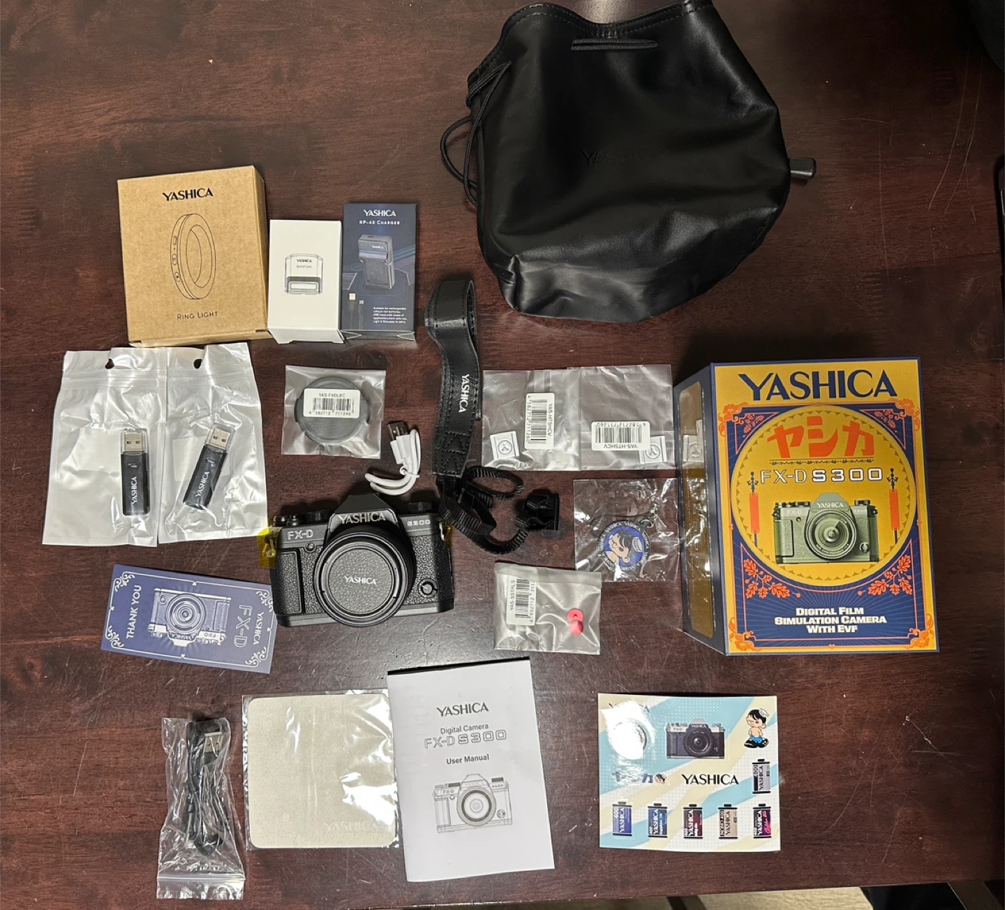 Brand New Yashica FX-D S300 digital simulation camera, it comes with a lot of accessories. Included is a ring light, a USB charger, and two USB drives. It also has a strap and a carrying bag.