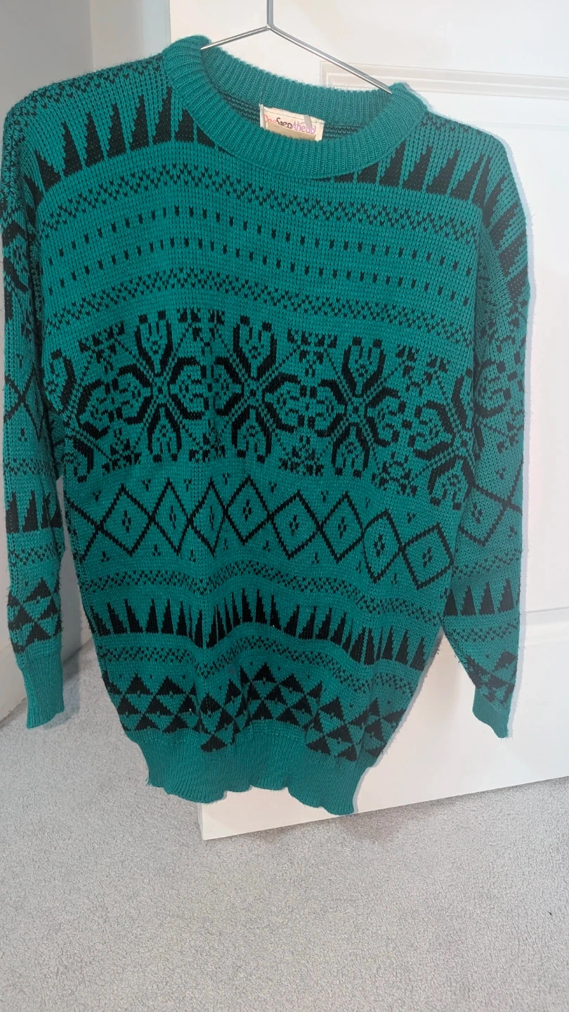 Cozy knit sweater featuring a classic crewneck style with a bold teal and black geometric pattern. It's made from a soft, durable material perfect for cooler weather. This sweater adds a retro flair to any casual outfit!