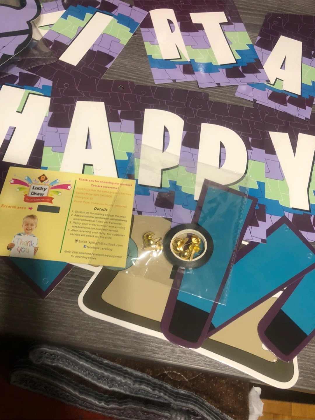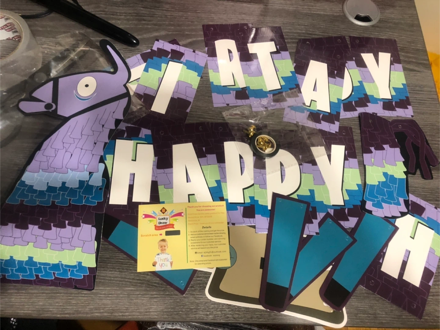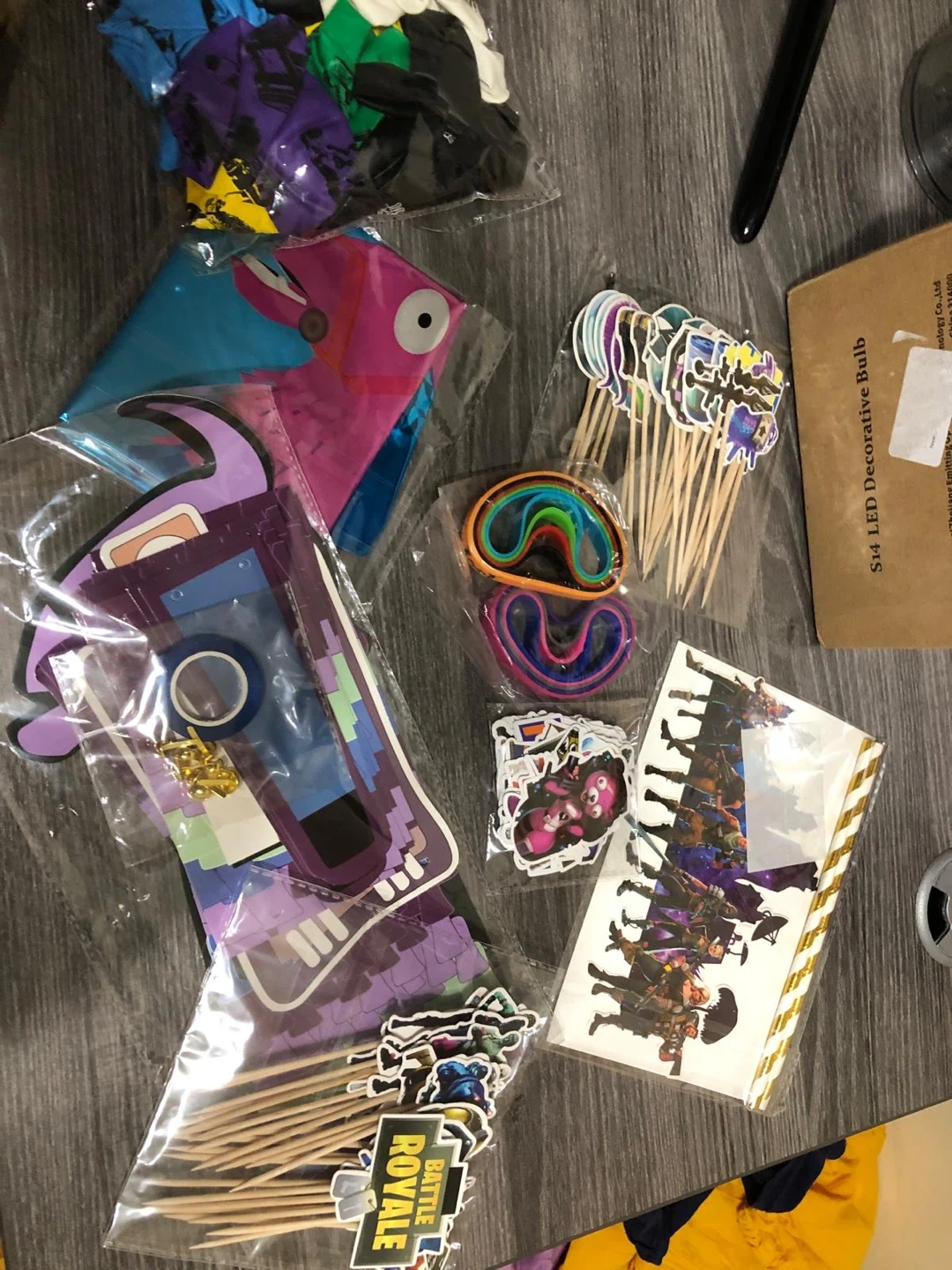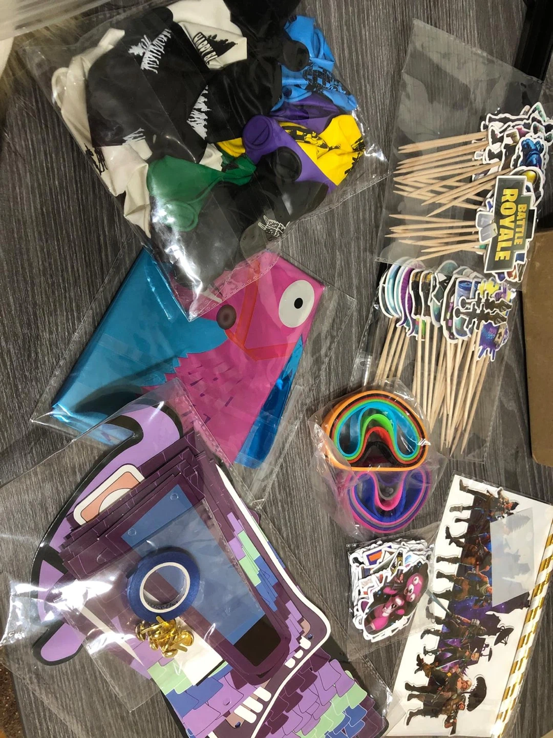 This is a new bundle of Fortnite-themed party decorations. It includes balloons, cake toppers, and stickers. Perfect for a Fortnite fan's birthday party!