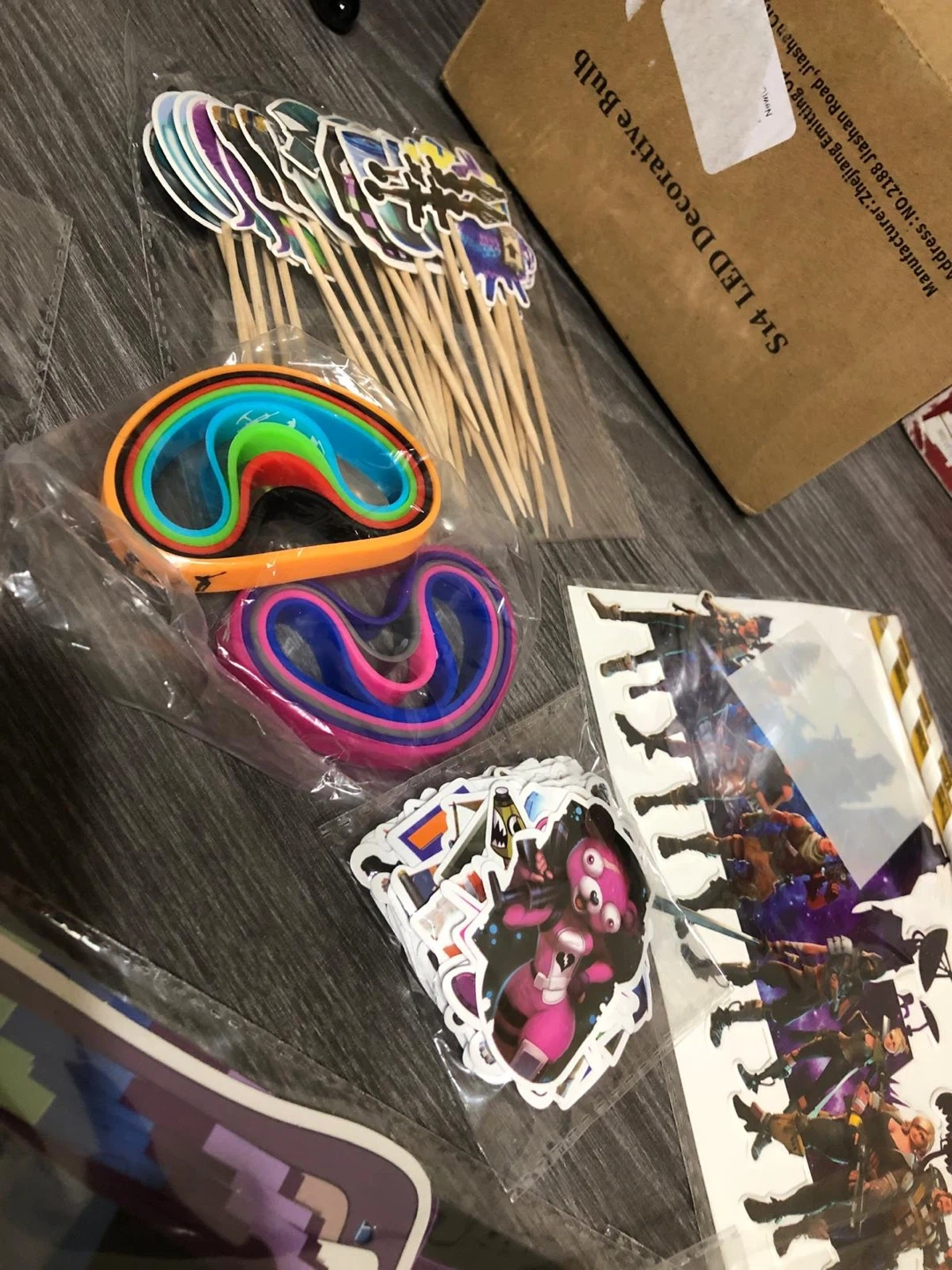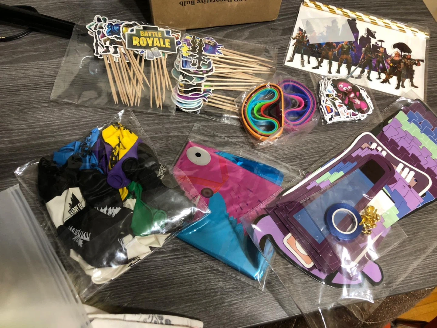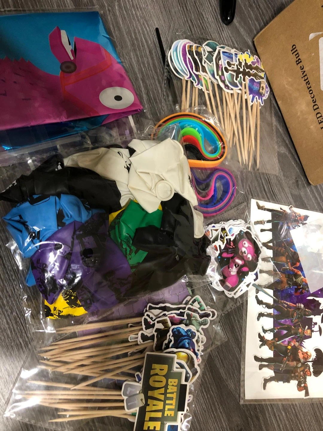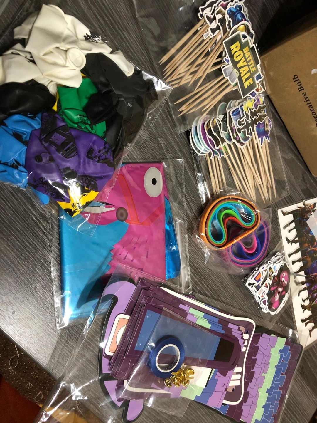 This is a new bundle of Fortnite-themed party decorations. It includes balloons, cake toppers, and stickers. Perfect for a Fortnite fan's birthday party!