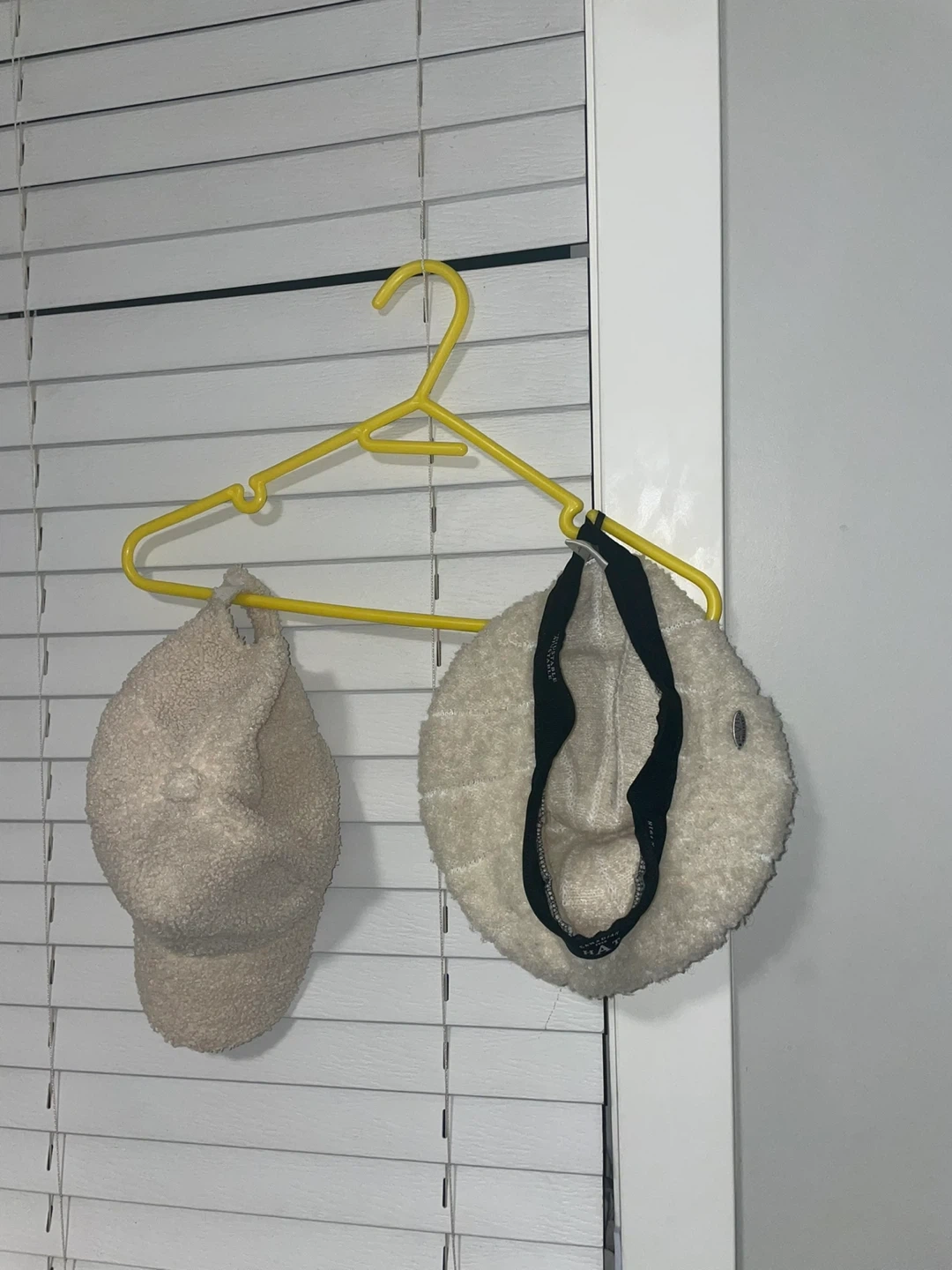 Two cozy fleece hats for winter & Spring warmth. Includes a baseball cap style and a beret. Both are a light cream colour.