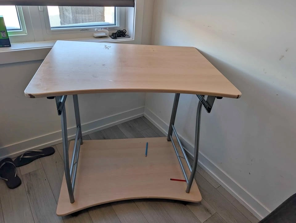 Small computer desk light wood metal legs, with wheels