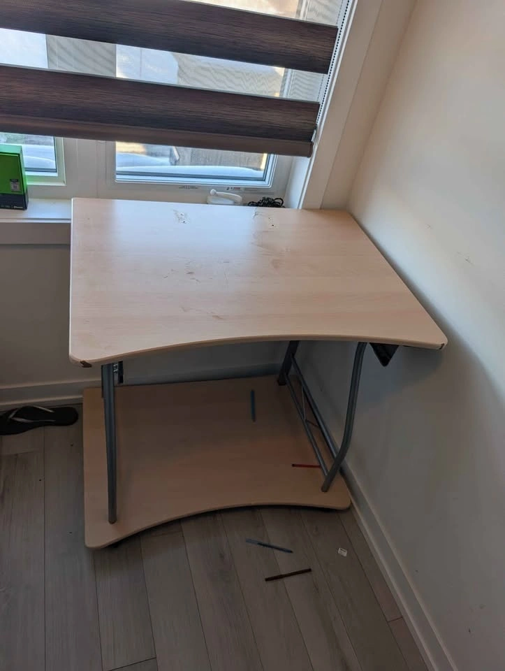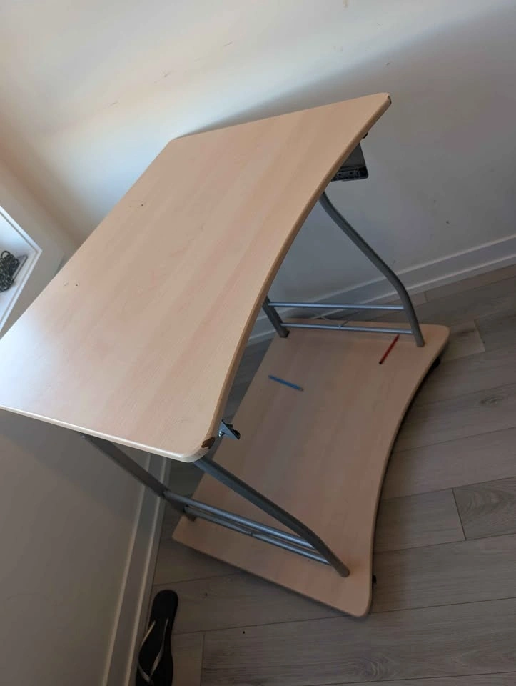 Versatile desk with light wood finish. Has a curved top and a handy lower shelf. Metal legs provide good support. Good for small spaces or a home office setup.