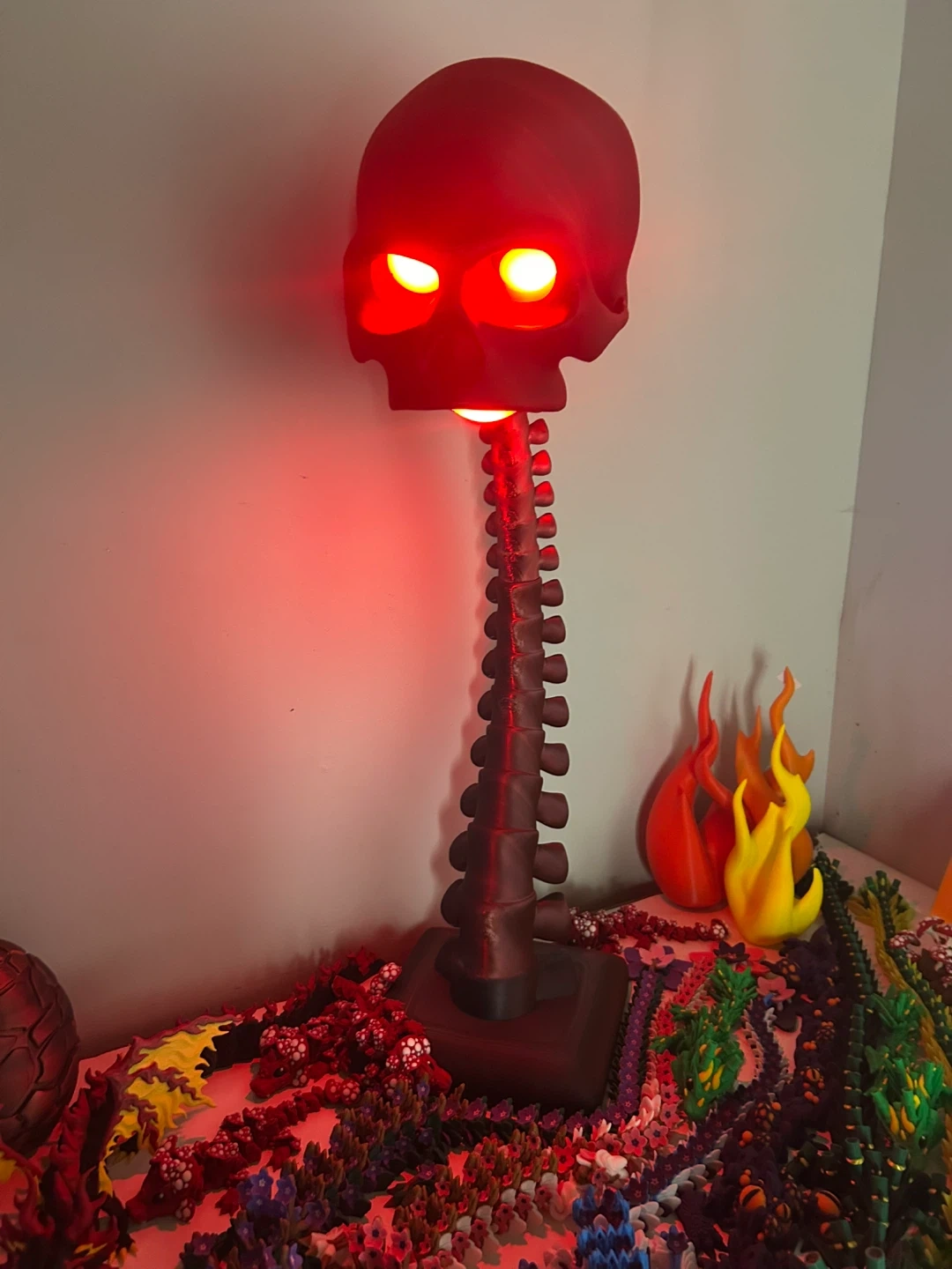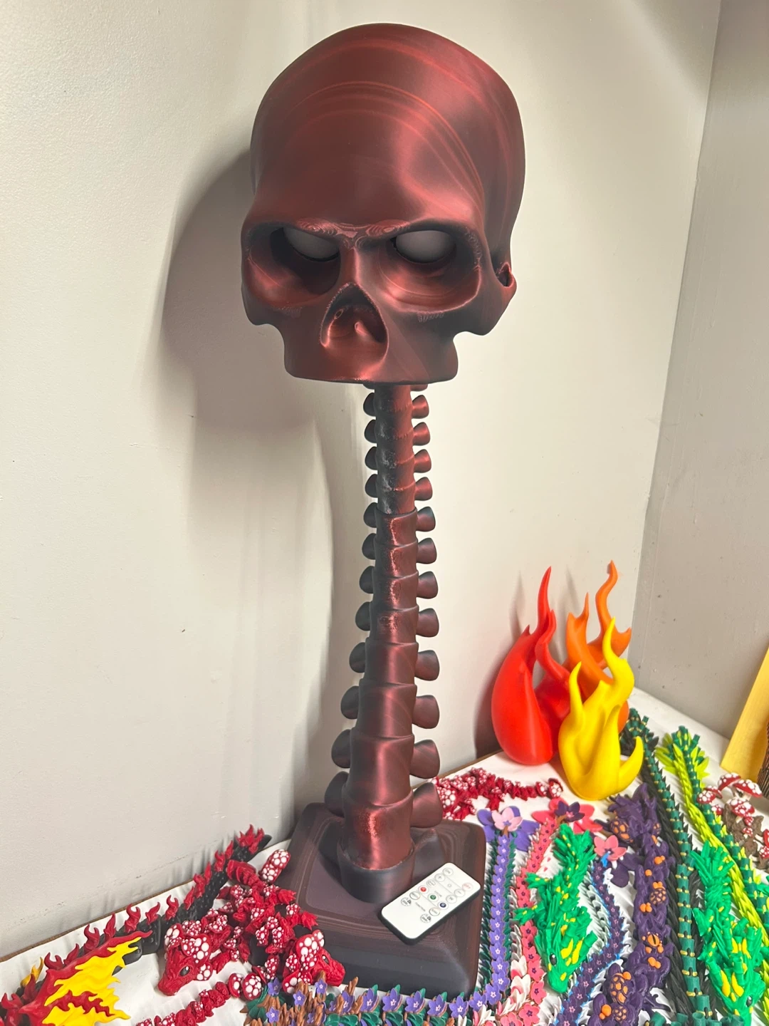 Check out this unique 3D printed skull and spine decoration! It's a cool piece to add to any room or collection. The skull has a stand and the eyes light up red. It's in great condition and ready for a new home