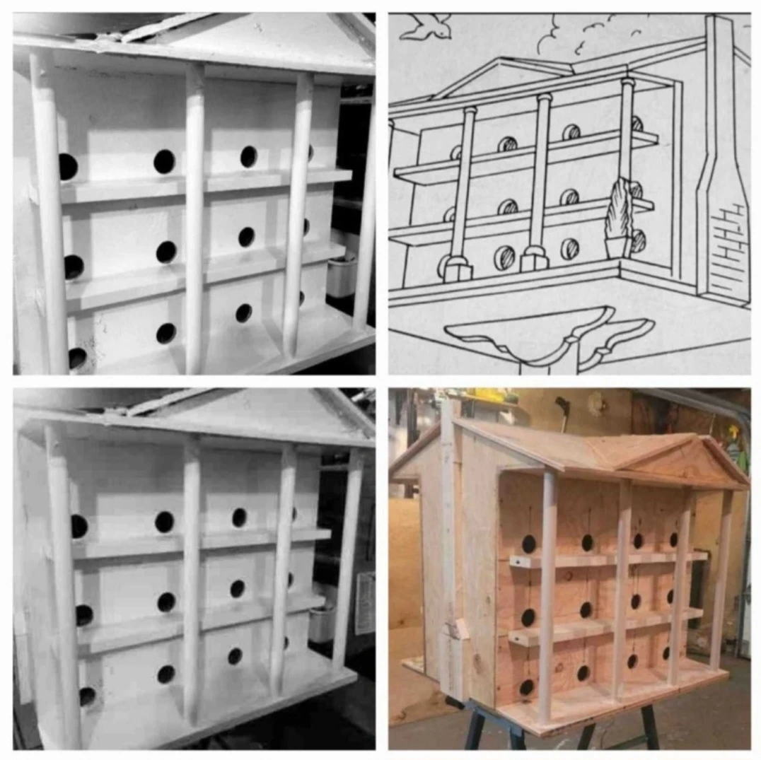 Multi-tiered wooden birdhouse designed for nesting birds. It features several individual compartments, each with a circular entrance. Constructed from plywood and wood dowels. A simple, functional shelter for backyard birds. Pro.\nBable, Martin birdhouse, with 24 rooms ready to go.Purple martins are coming soon...