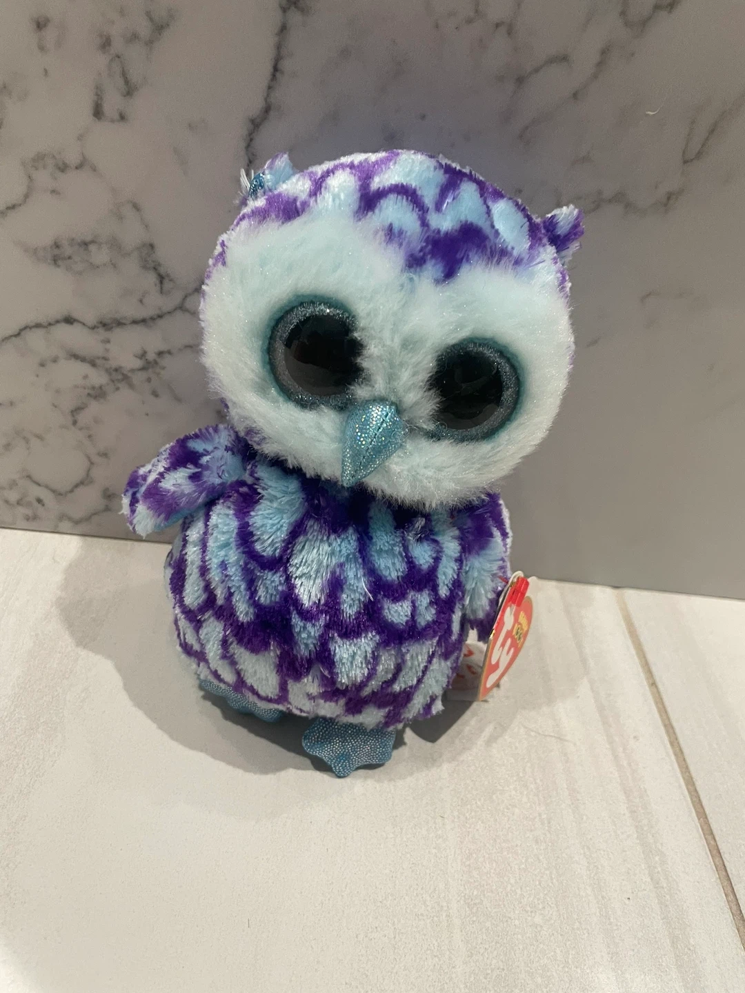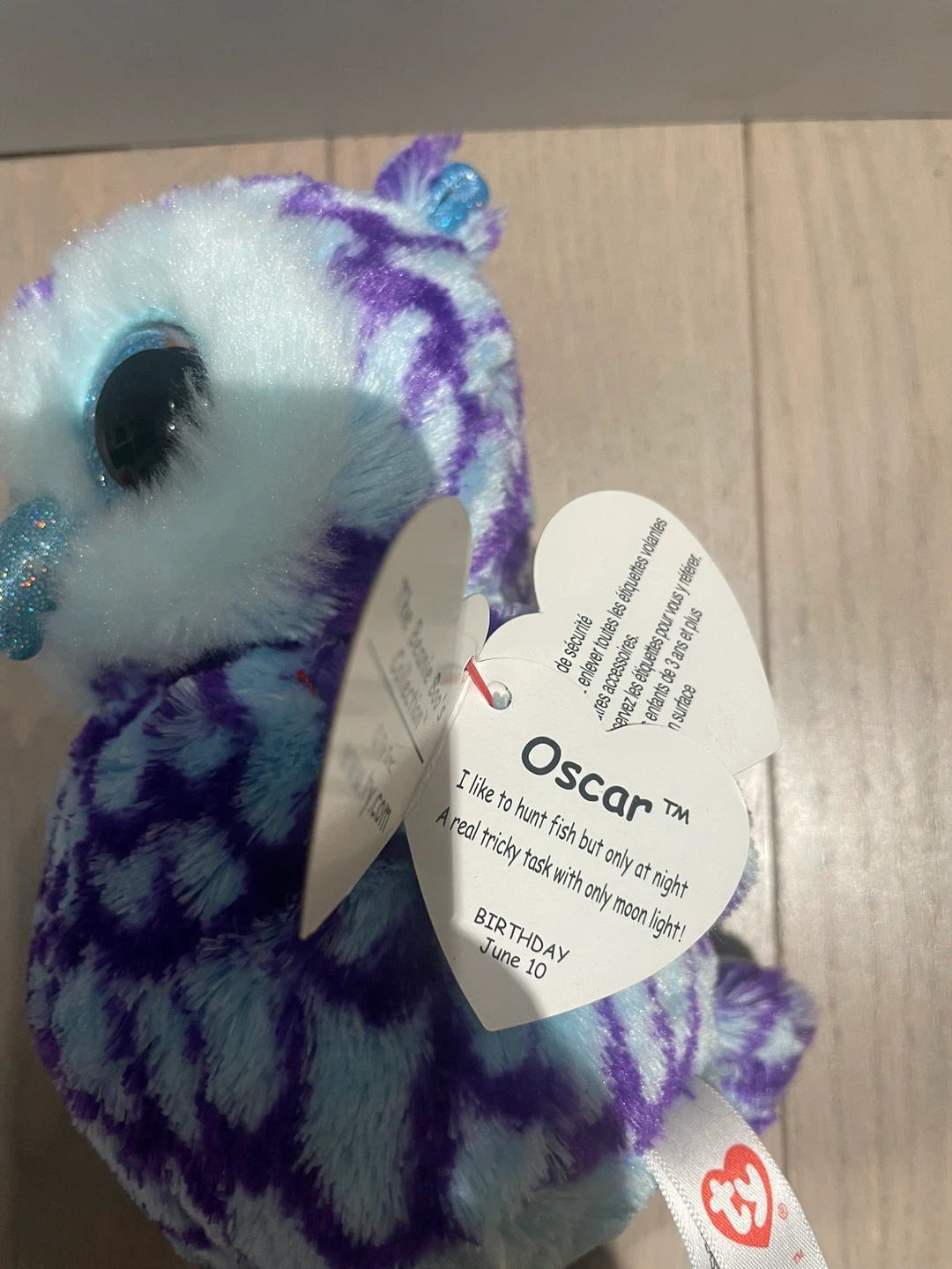 This is Oscar, a cute Beanie Boo's owl plush toy from Ty. He's coloured in light blue and purple. Oscar's birthday is June 10. He likes to hunt fish but only at night! It's a real tricky task with only moonlight!
